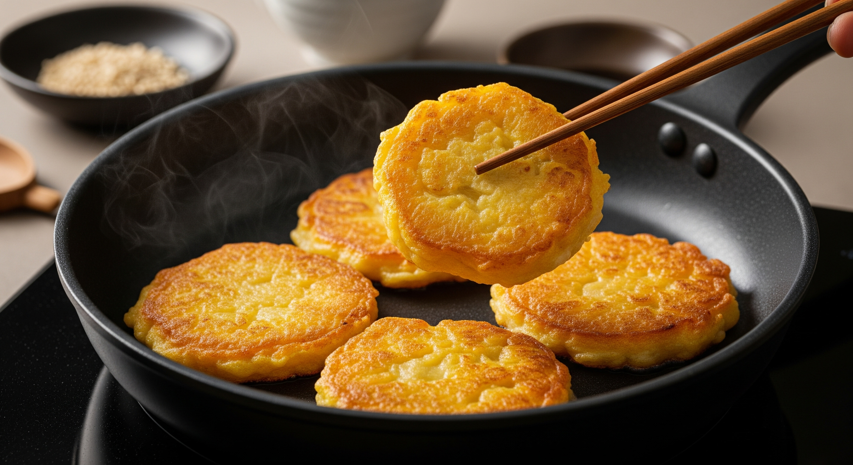5. 달군 팬에 식용유를 넉넉히 두르고 반죽을 한 국자씩 떠서 얇고 넓게 펴줍니다.