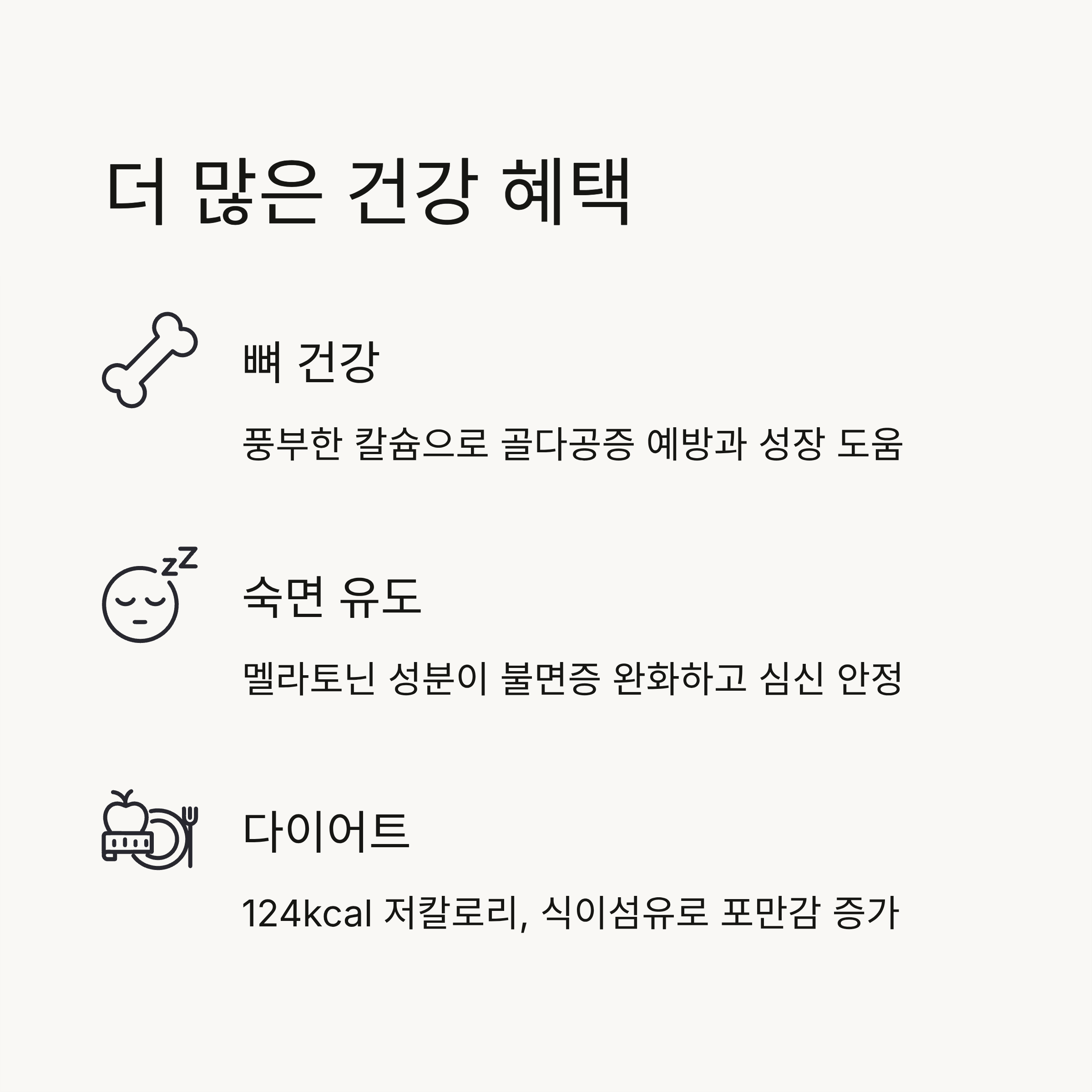또한, 토란에 함유된 멜라토닌 성분은 수면 주기를 조절하고 심신을 안정시켜 숙면을 유도하는 효과가 있어 불면증으로 고생하는 분들에게도 좋은 식품입니다. 뼈 건강은 물론 숙면까지 돕는 똑똑한 토란 효능입니다.