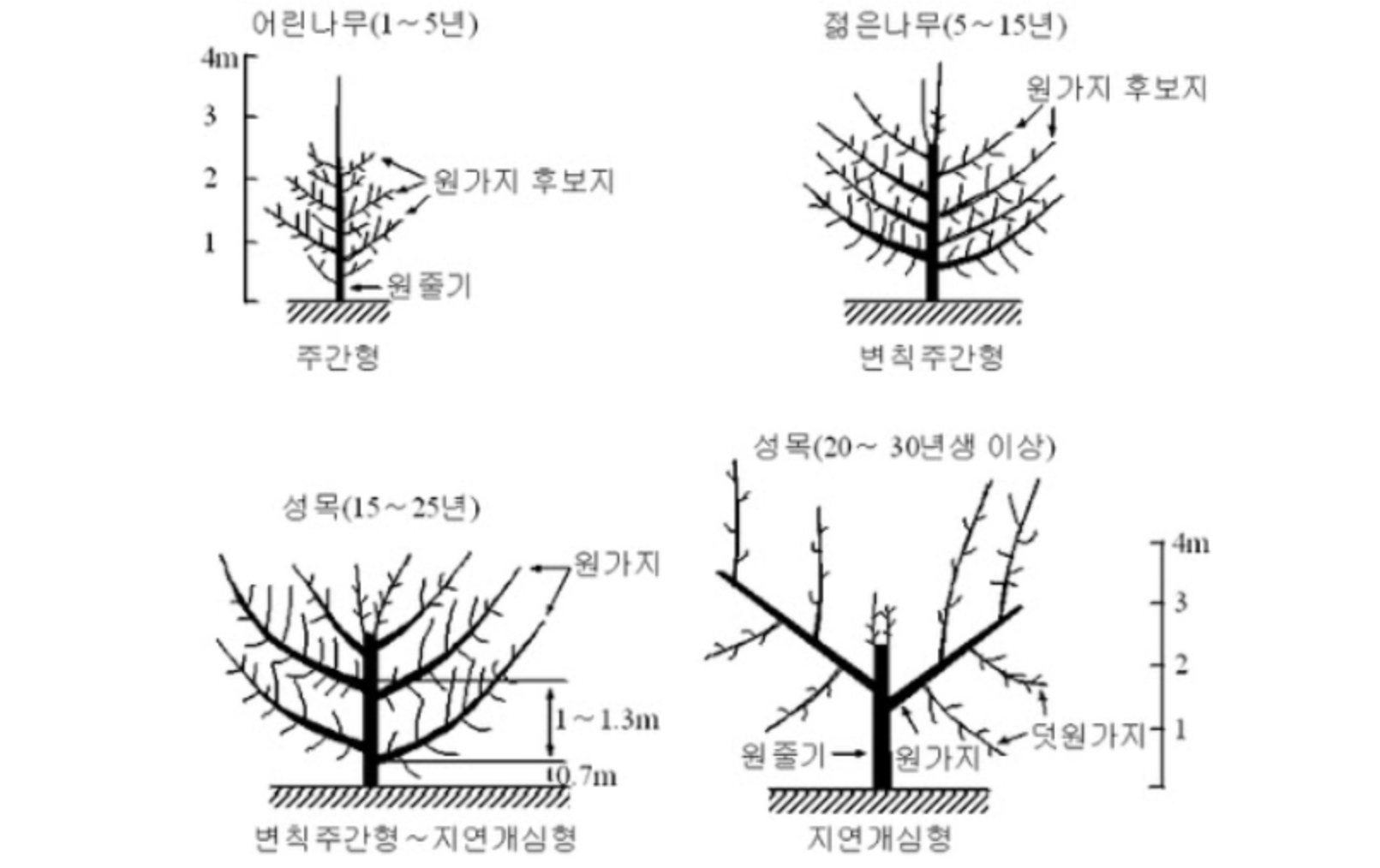 하늘을 향해 수직으로 쭉 뻗은 가지(도장지)와 땅으로 축 처진 가지는 양분만 소모하고 좋은 열매를 맺지 못합니다. 이런 가지들은 과감하게 잘라주어 나무 중심부까지 햇빛이 잘 들어가도록 만들어 줍니다.