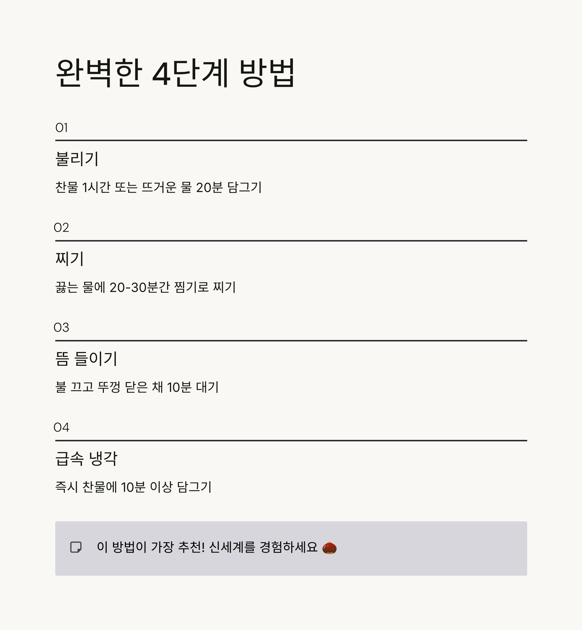 1단계: 불리기 | 밤을 깨끗이 씻어 찬물에 1시간 또는 뜨거운 물에 20분 정도 담가둡니다. | 껍질이 수분을 머금어 부드러워지는 과정입니다. |