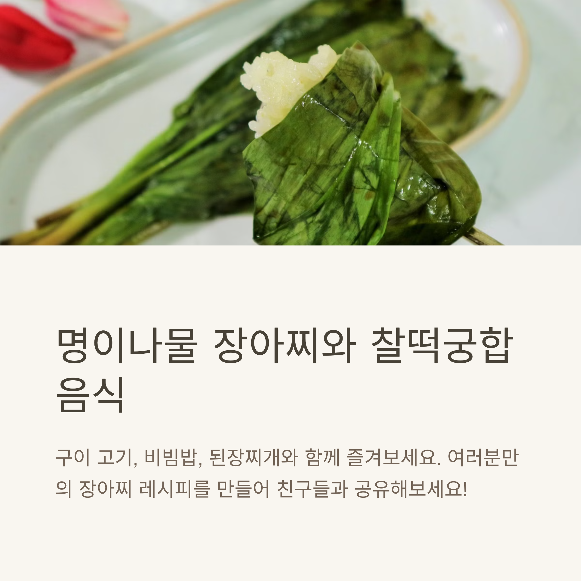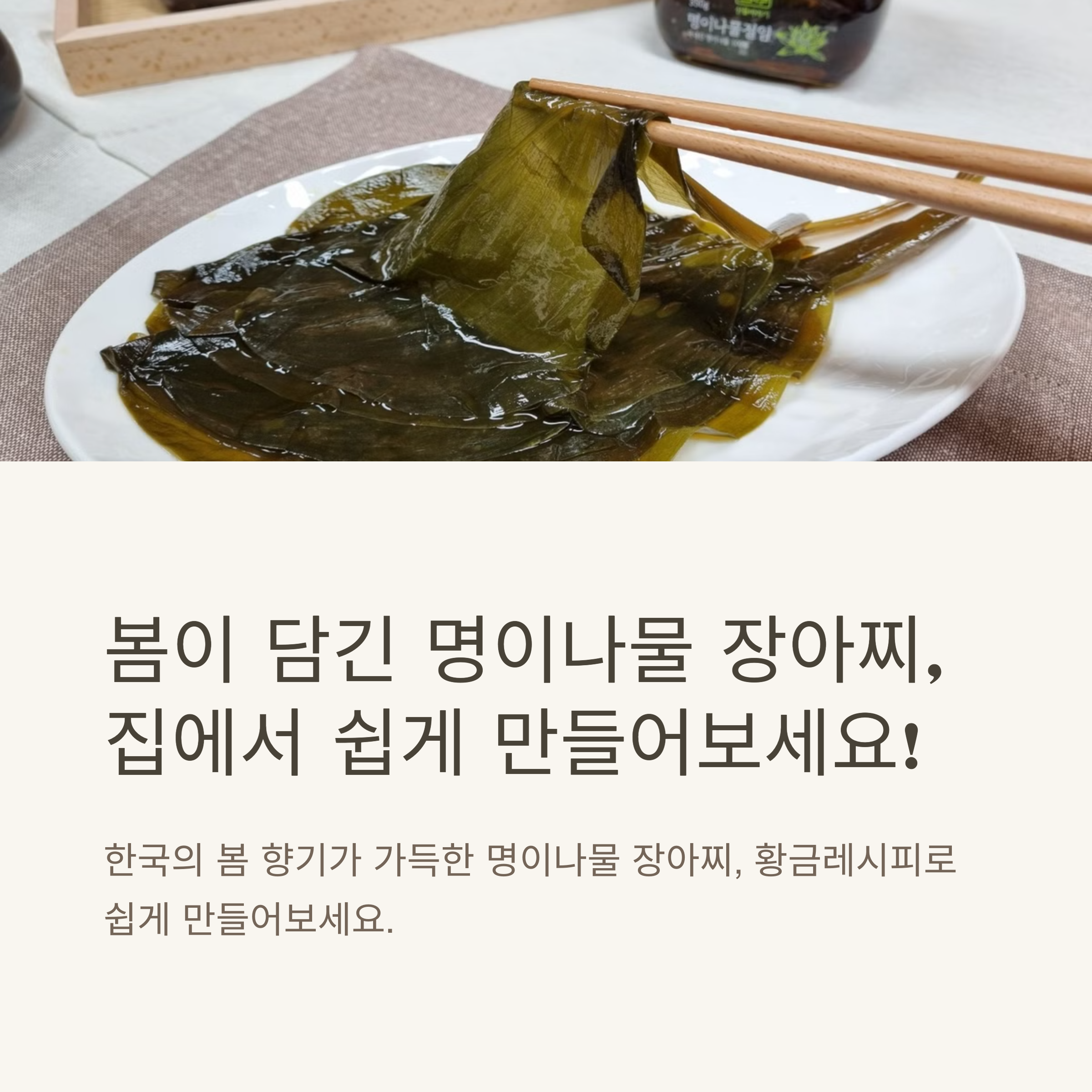 명이나물은 산마늘이라고도 불리며, 제철은 4월~5월이에요. 신선한 잎을 구입하거나 채취한 걸 사용하면 최고의 맛을 낼 수 있어요.