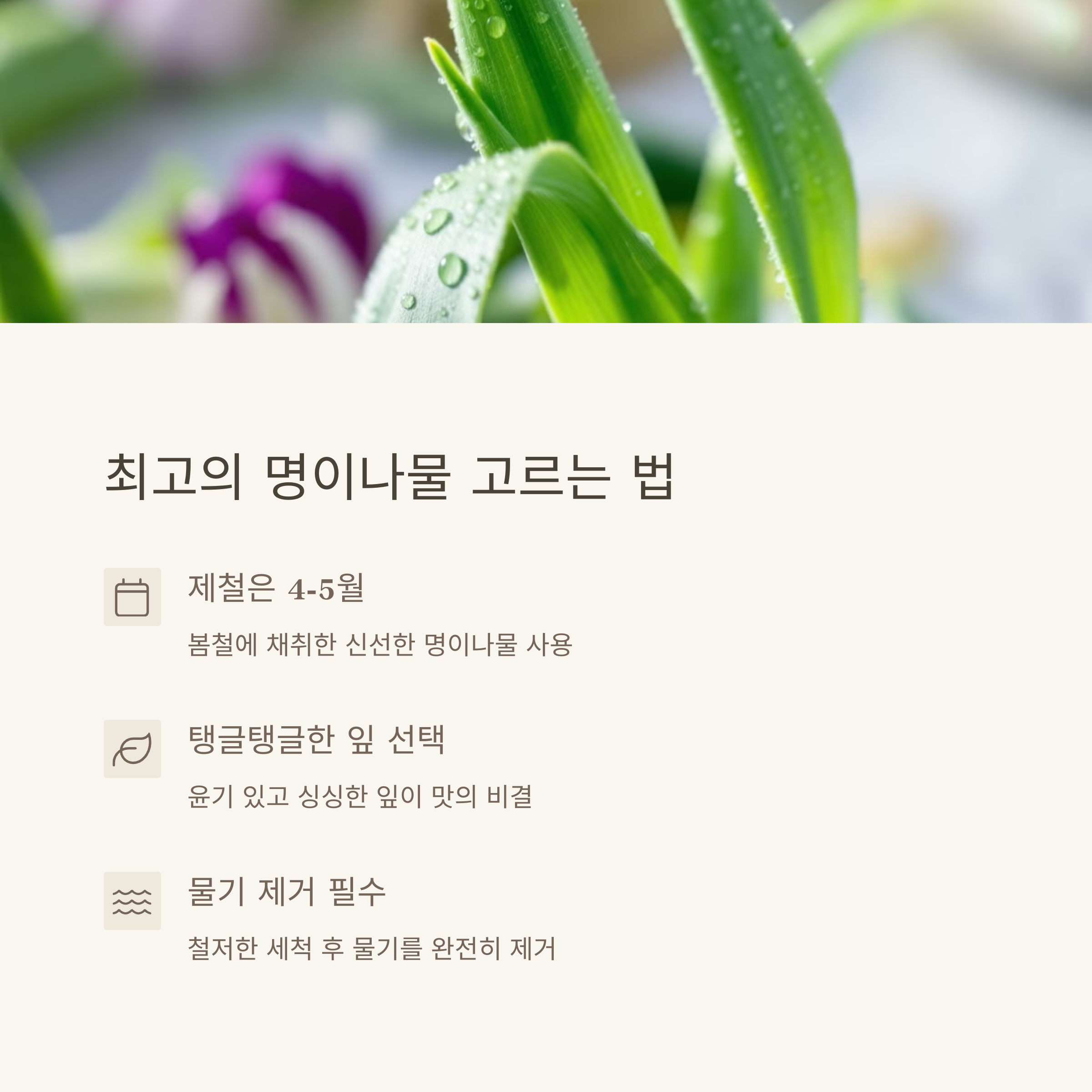 명이나물은 산마늘이라고도 불리며, 제철은 4월~5월이에요. 신선한 잎을 구입하거나 채취한 걸 사용하면 최고의 맛을 낼 수 있어요.
