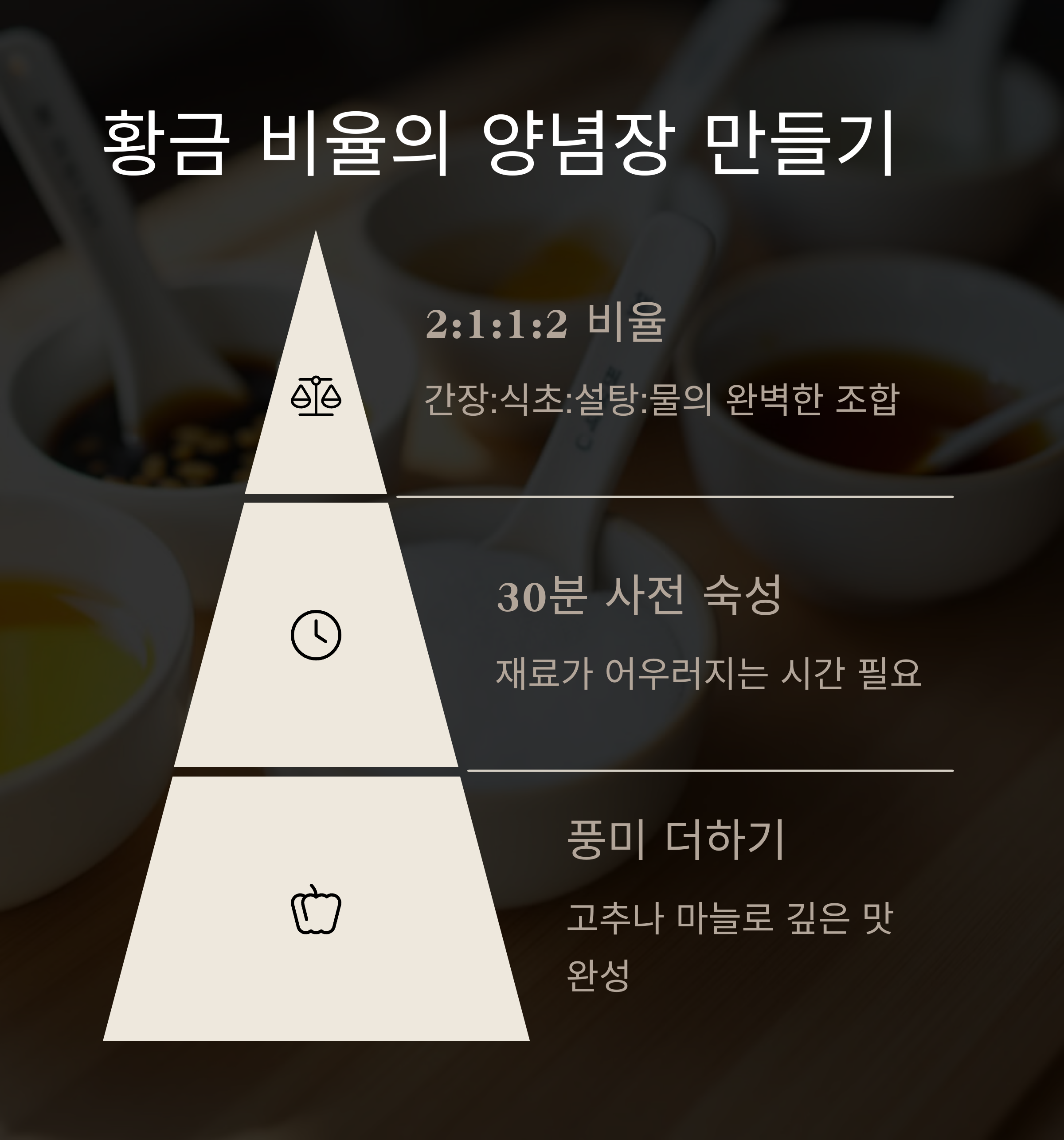- 간장, 식초, 설탕, 물을 2:1:1:2 비율로 섞어 기본 양념장 완성.