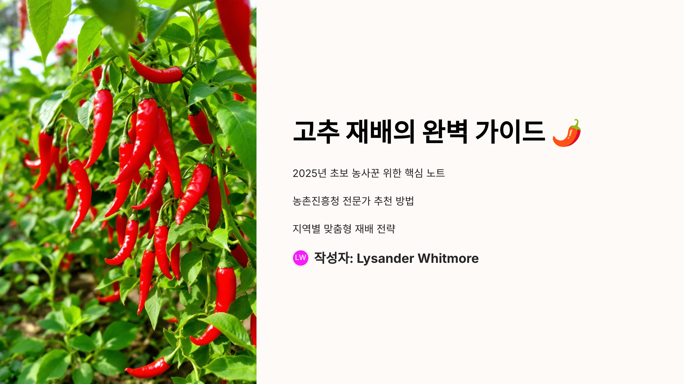 이 가이드를 따라 밭을 준비하고, 모종을 심고, 관리까지 차근차근 해보세요. 맛있는 고추로 가득한 2025년을 기대해봐요! 🌶️ 더 궁금한 점은 농촌진흥청에서 확인해보세요.