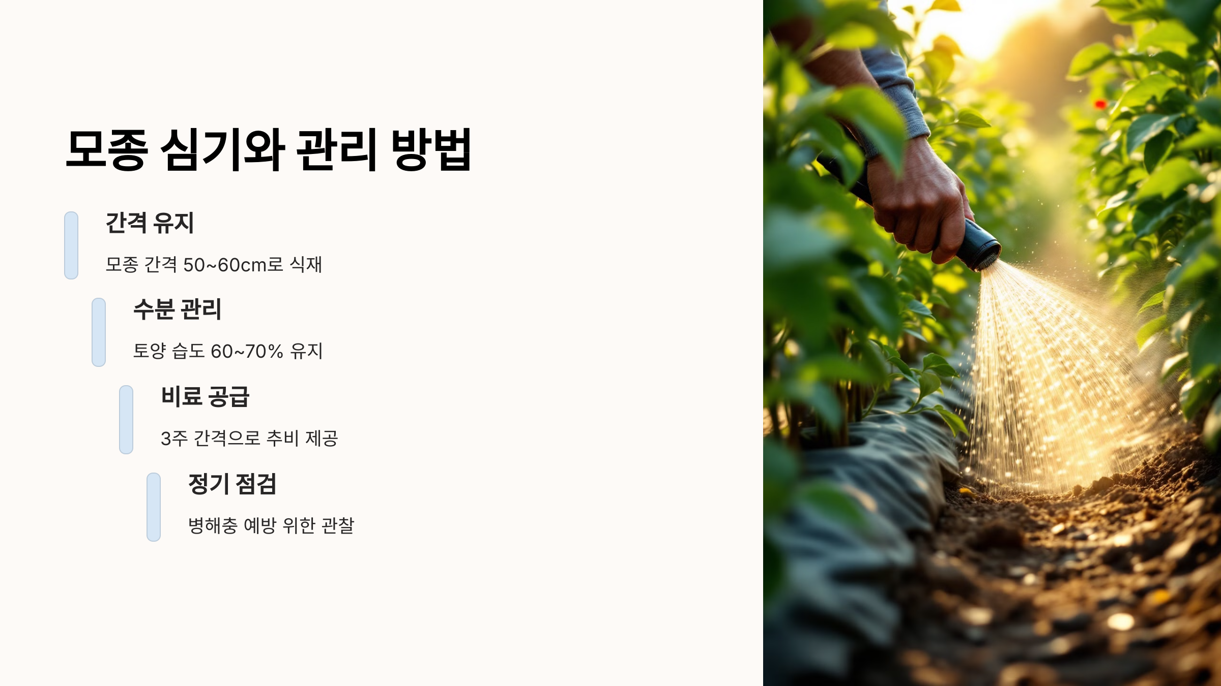 4. 물주기: 심은 직후 물 1~2L를 주고, 2~3일간 뿌리 활착 관찰.