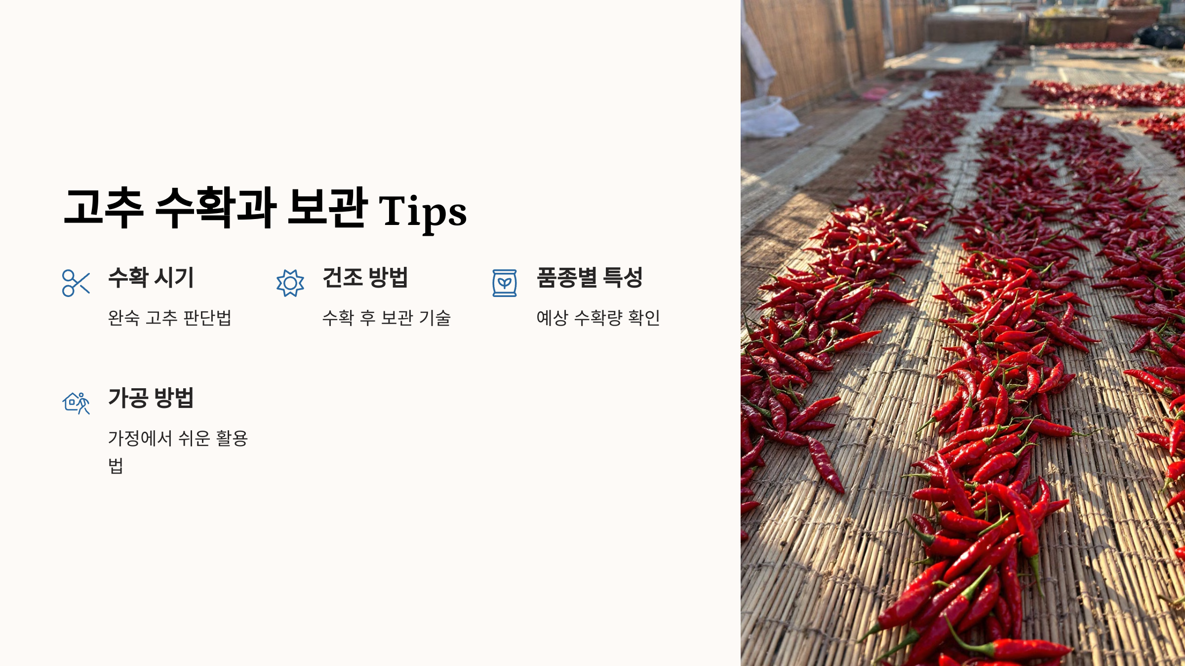 - 붉은고추: 완전히 붉어진 후(50~60g), 후숙 3~5일 후 건조 시 색감 UP.