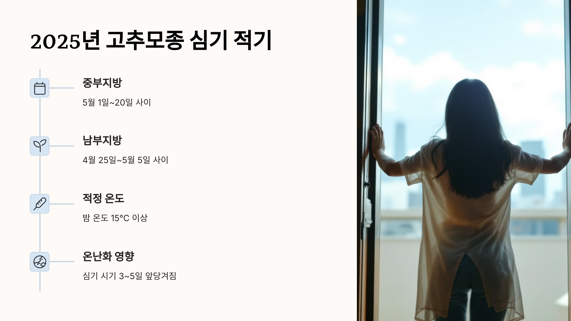 2025년 고추모종 심는 시기는 지역별로 조금씩 달라요. 중부지방은 5월 초순(5월 1일~10일)에서 중순(5월 11일~20일), 남부지방은 4월 말(4월 25일~30일)에서 5월 초(5월 1일~5일)가 적당합니다.