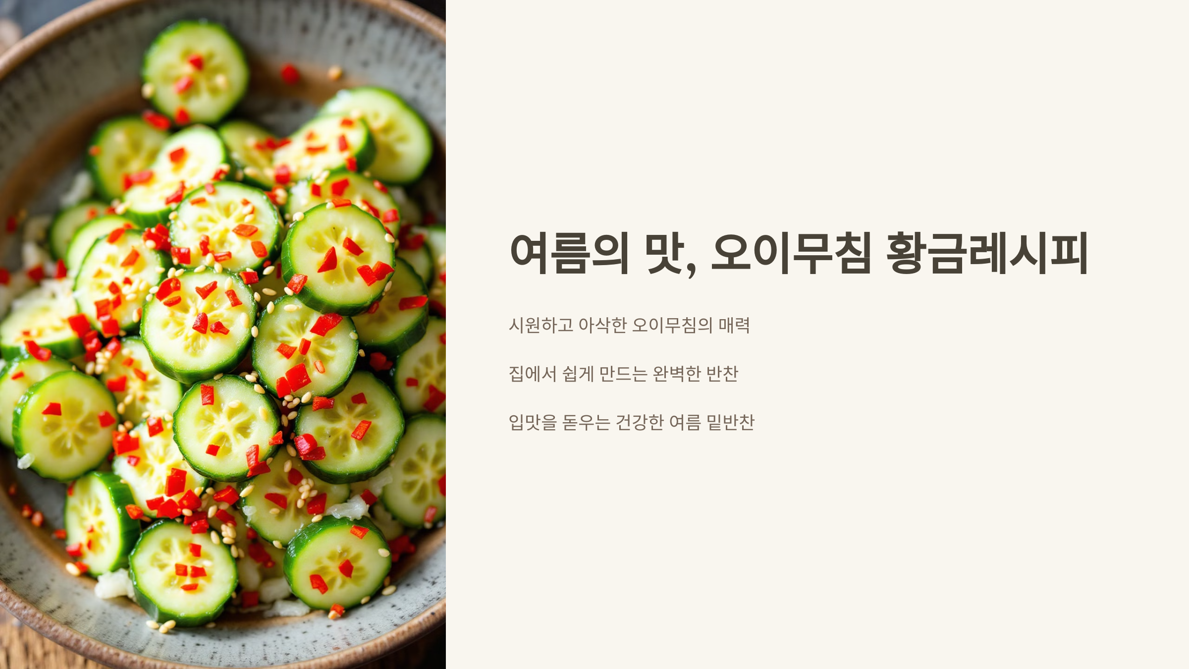 안녕하세요, 여러분! 😊 오늘은 여름철 입맛을 살려주는 대표 반찬, 오이무침 황금레시피를 소개할게요.