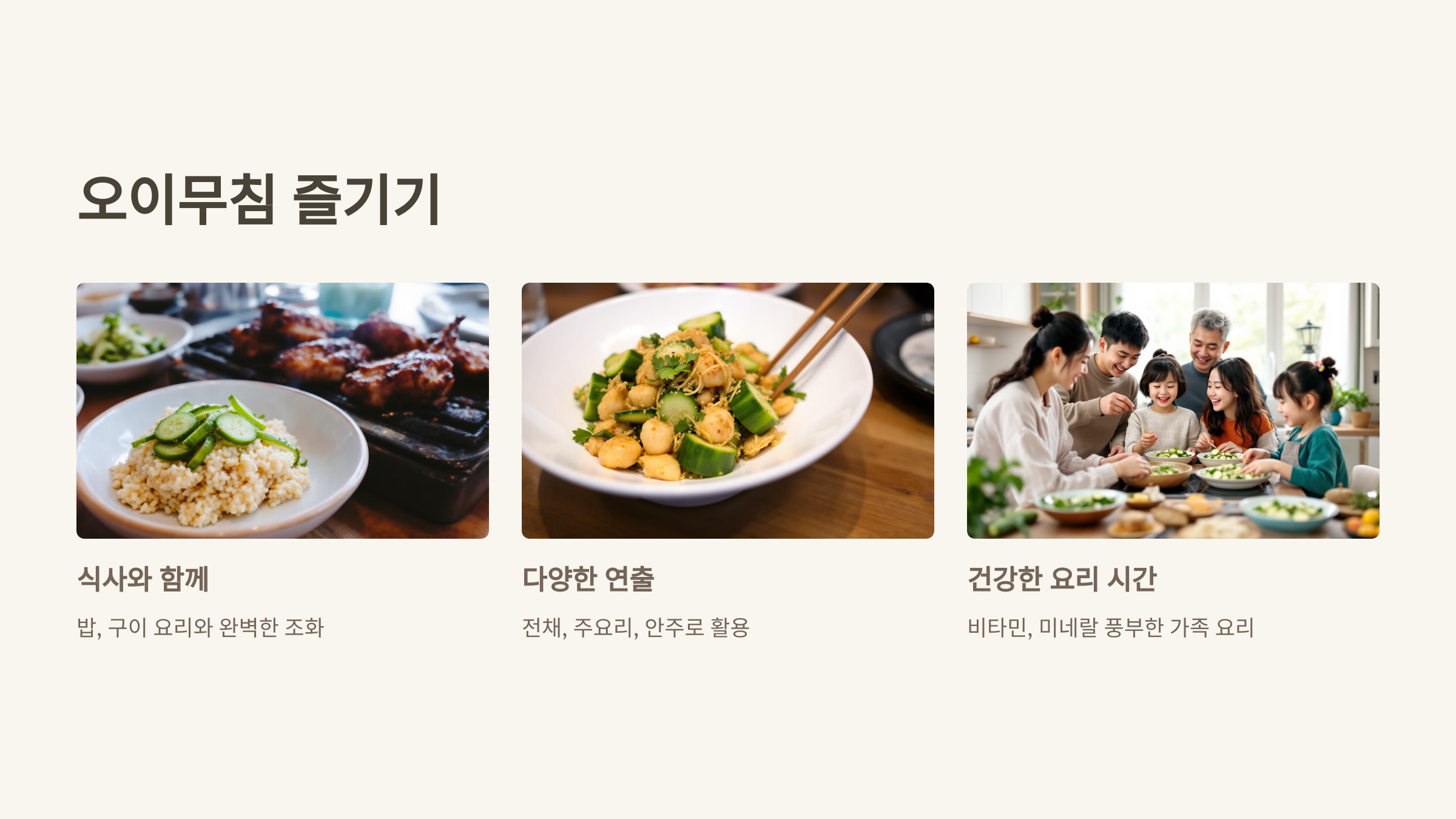 오이는 수분이 많아 시원하고, 새콤달콤한 양념과 버무려지면 밥 한 공기가 순식간에 사라지는 마법을 부려요.