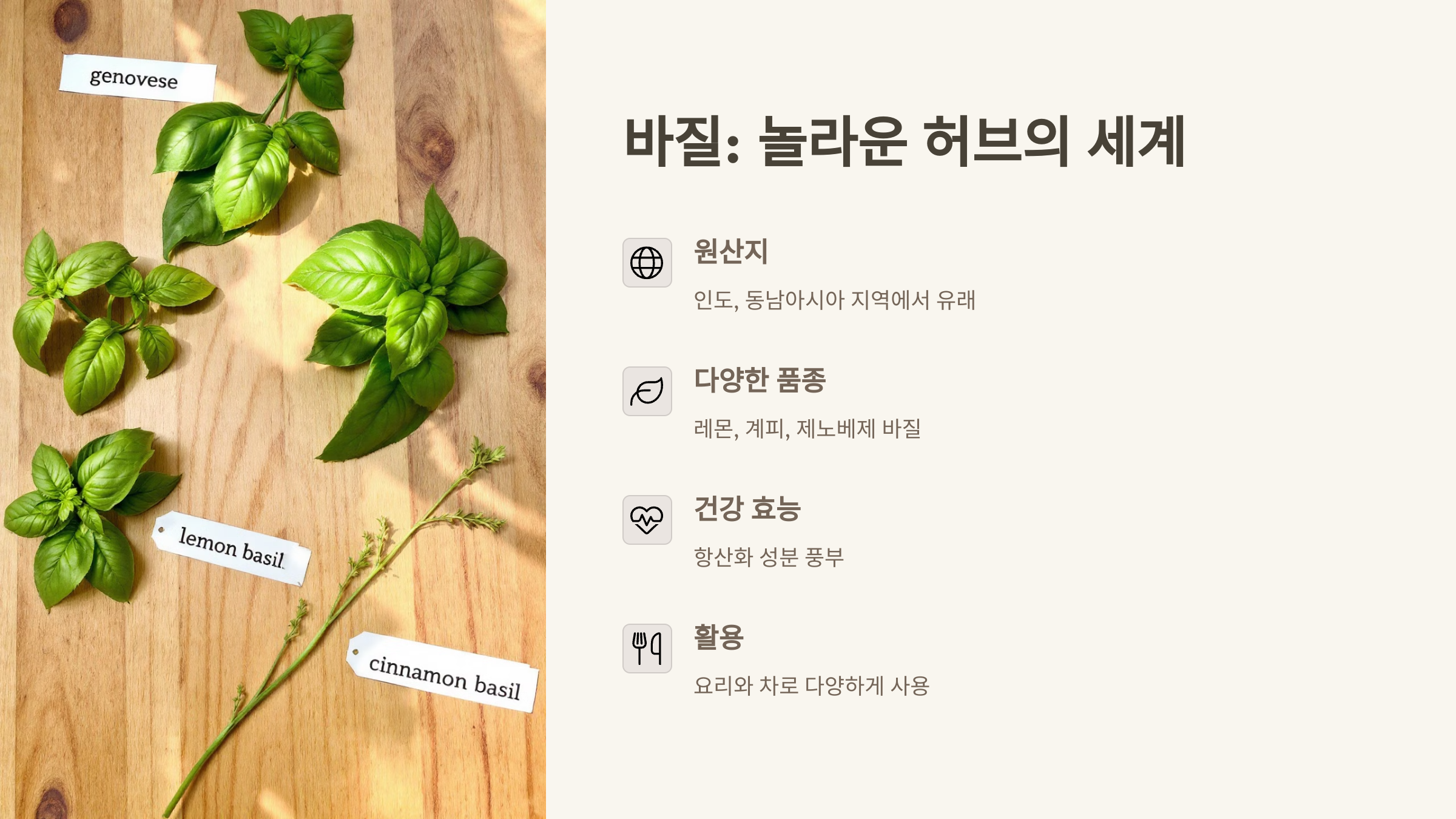 바질(Basil)은 꿀풀과에 속하는 한해살이 허브로, 학명은 *Ocimum basilicum*이에요。원산지는 인도와 동남아시아로, 따뜻한 기후를 좋아하며 독특한 향과 맛으로 전 세계적으로 사랑받죠。
