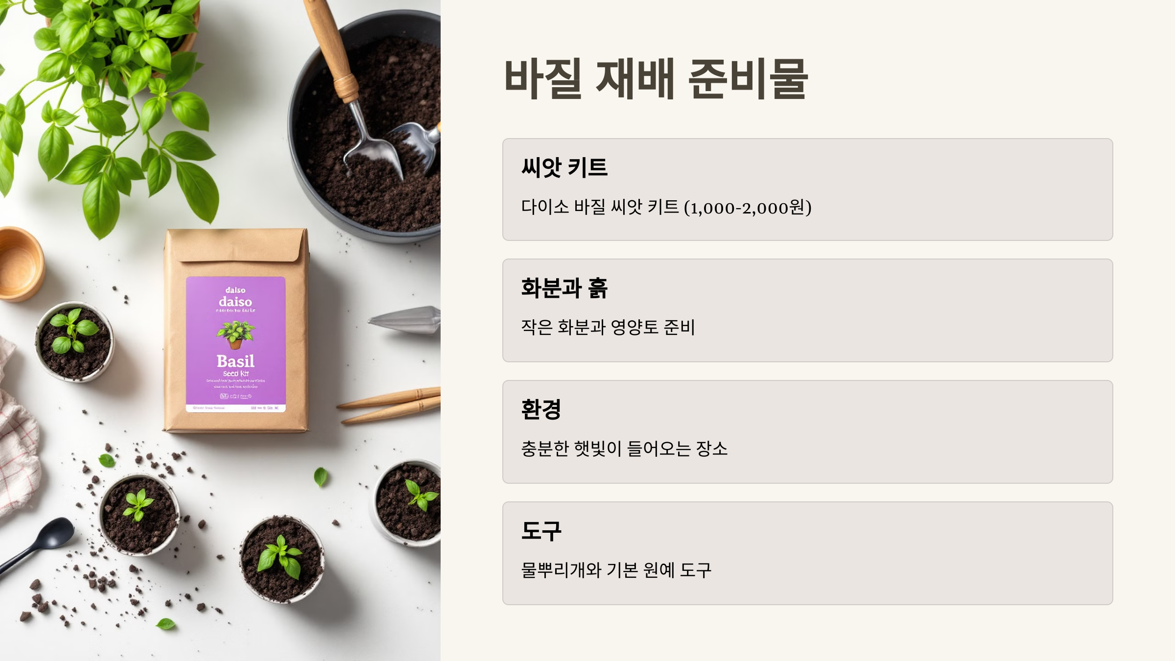 바질 키우기를 시작하려면 다이소에서 구입할 수 있는 기본 재료를 준비하세요。 아래는 필요한 목록이에요。
