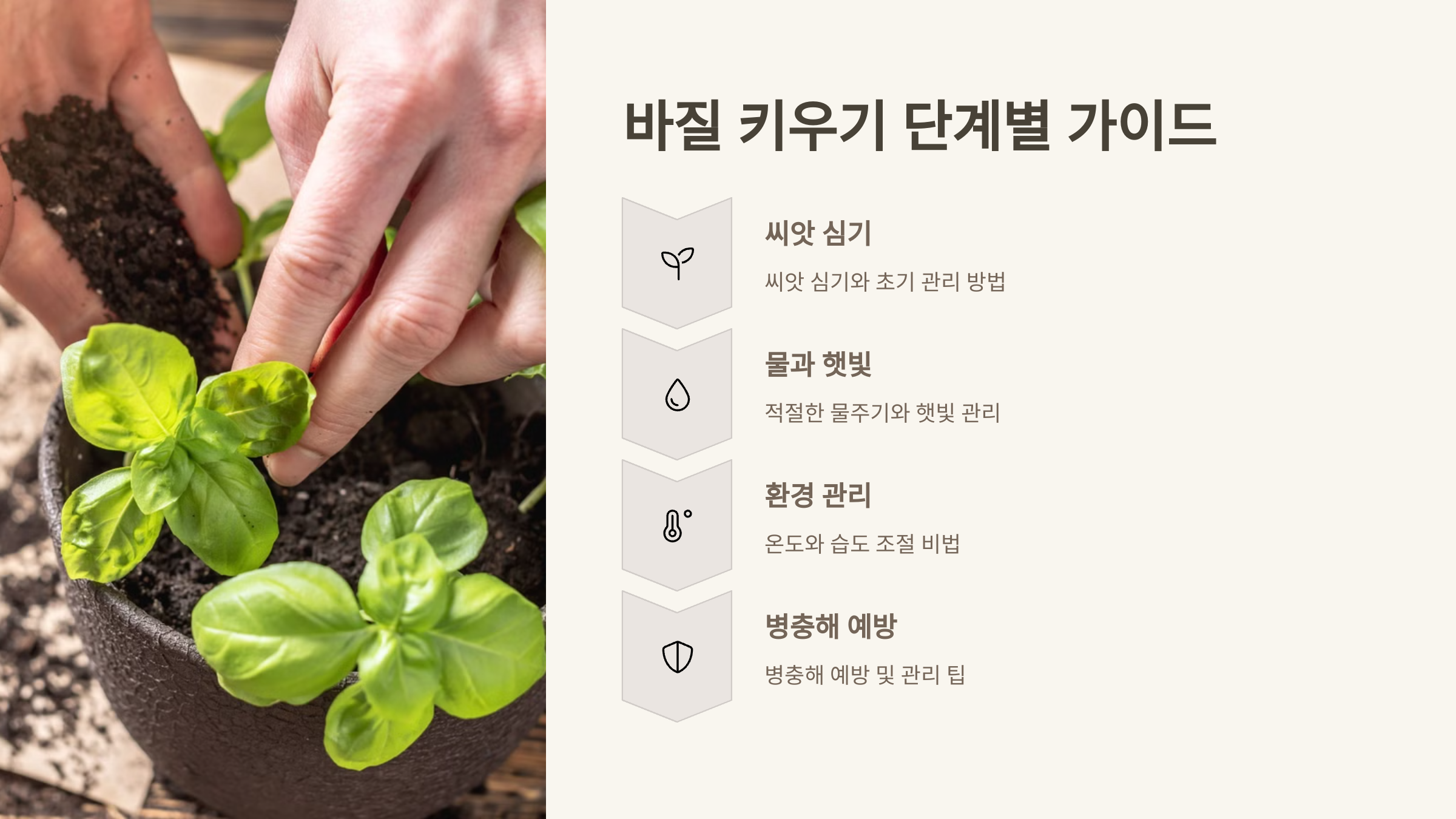 바질 키우기의 성공은 빛, 물, 온도 관리에 달렸어요。 실내에서 잘 자라도록 다음 단계를 따라주세요。