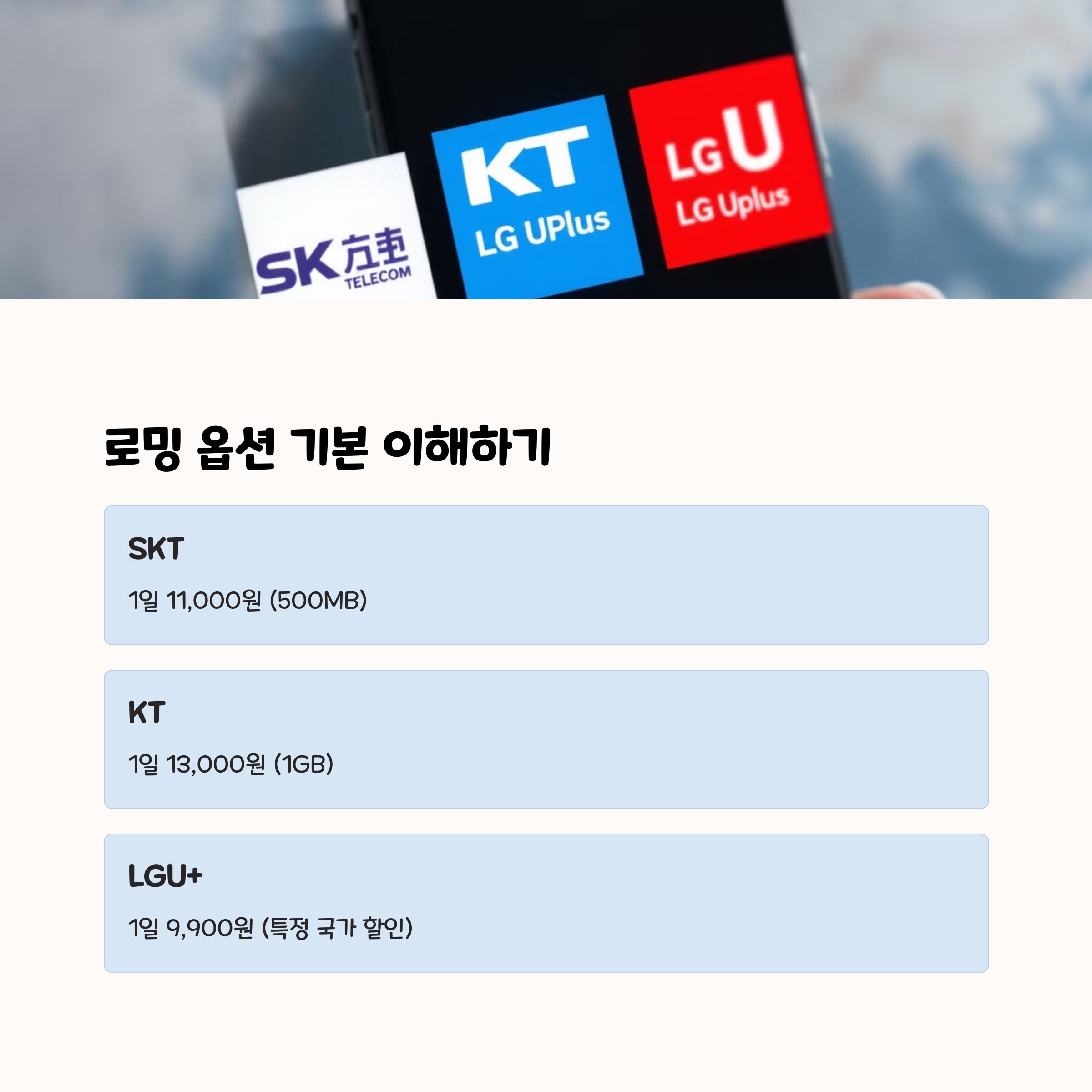 SKT는 1일 11,000원(500MB), KT는 13,000원(1GB), LGU+는 9,900원(특정 국가 할인) 수준이에요.