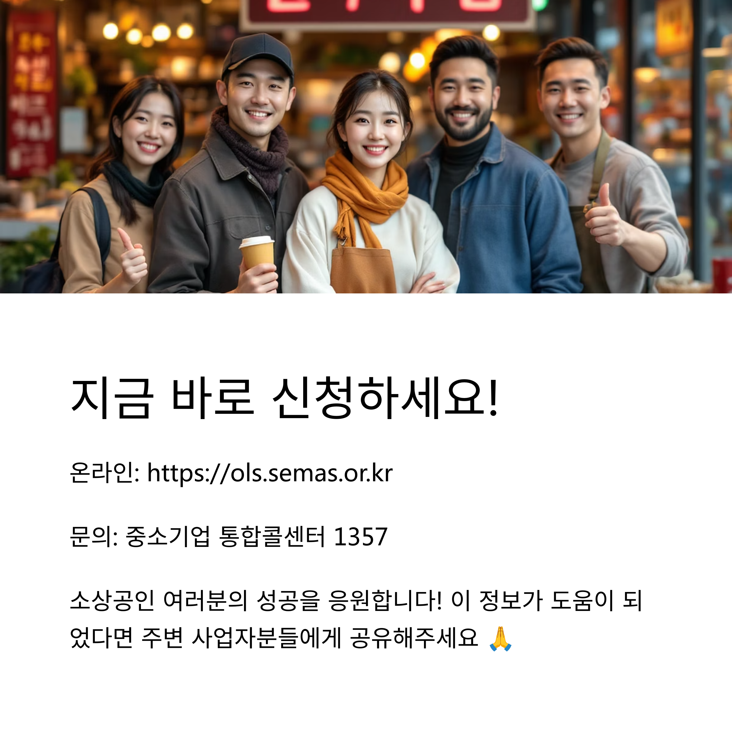 - 지원 대상 확인: 소진공 홈페이지(ols.semas.or.kr)에서 지원 대상 업종인지 확인하세요. 유흥업소, 금융업 등은 지원 제외예요.