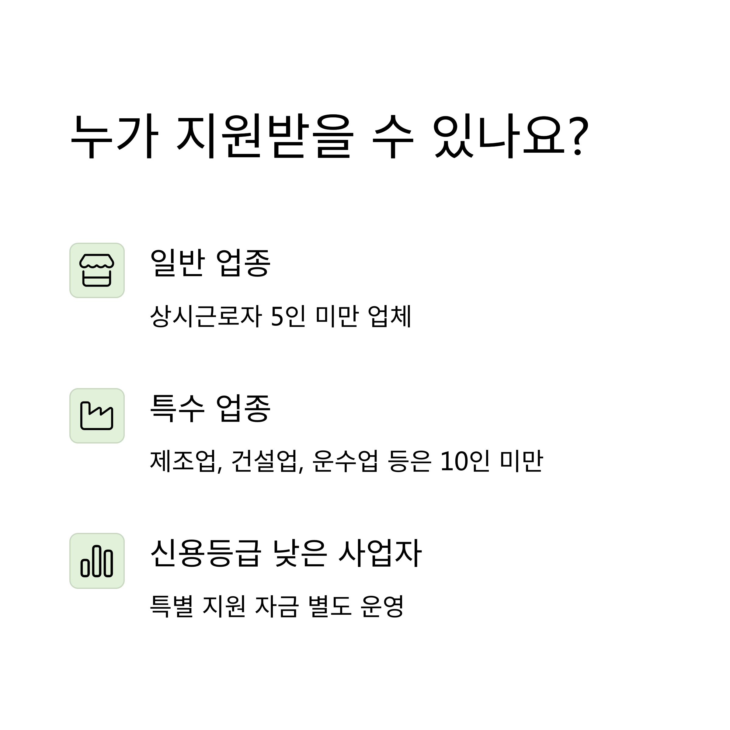 | 대상 | 소상공인(상시 근로자 5인 미만, 업종별 기준 상이) |