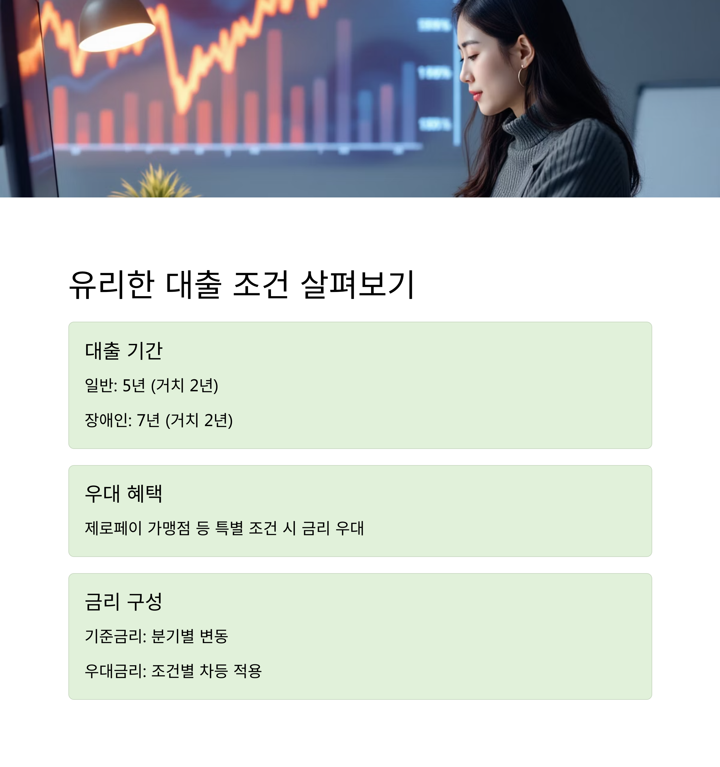 - 대출 실행: 심사 통과 후 자금이 입금돼요. 단, 예산 소진 시 조기 마감되니 접수 시작일(매 분기 초)을 놓치지 마세요!