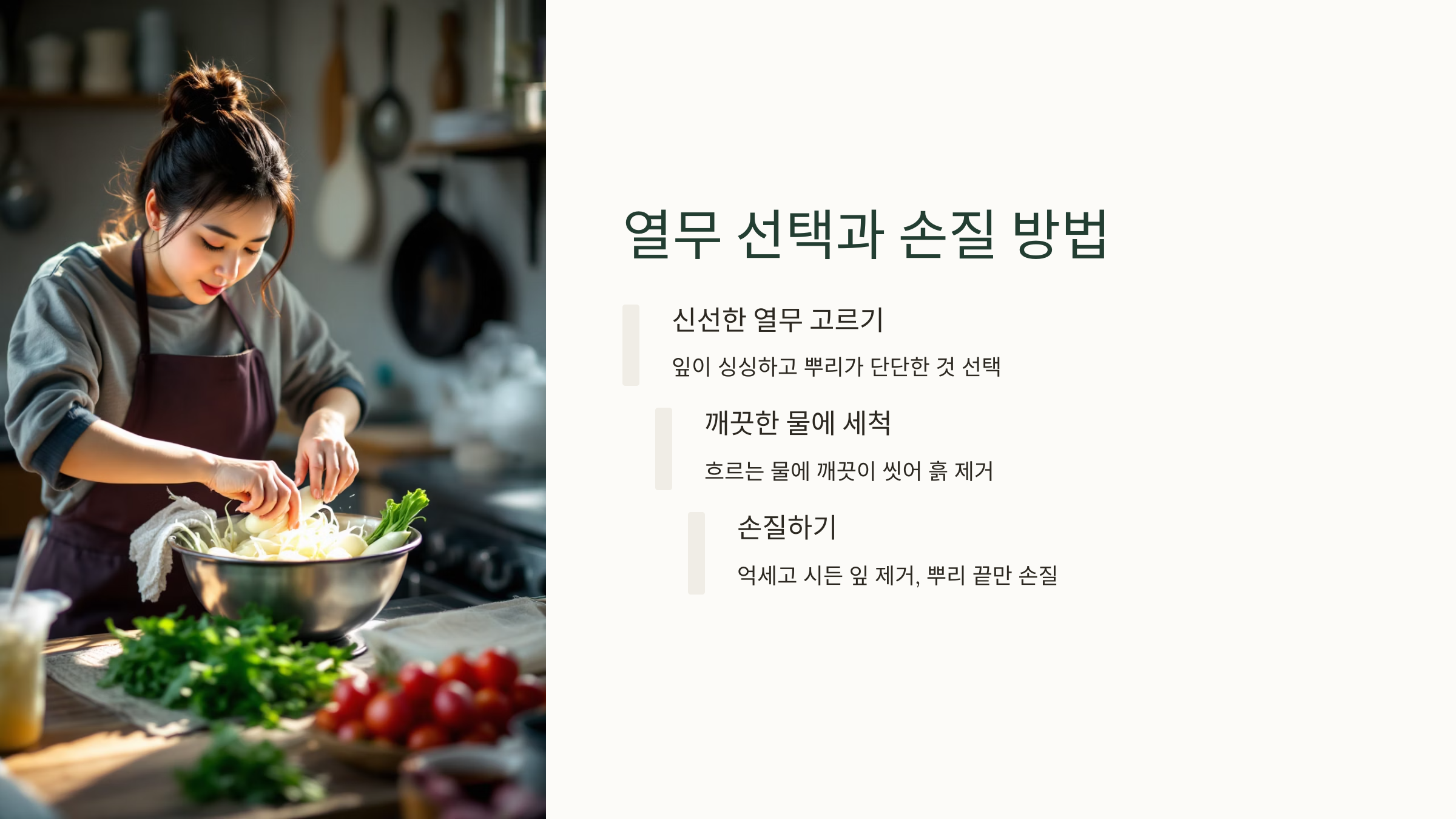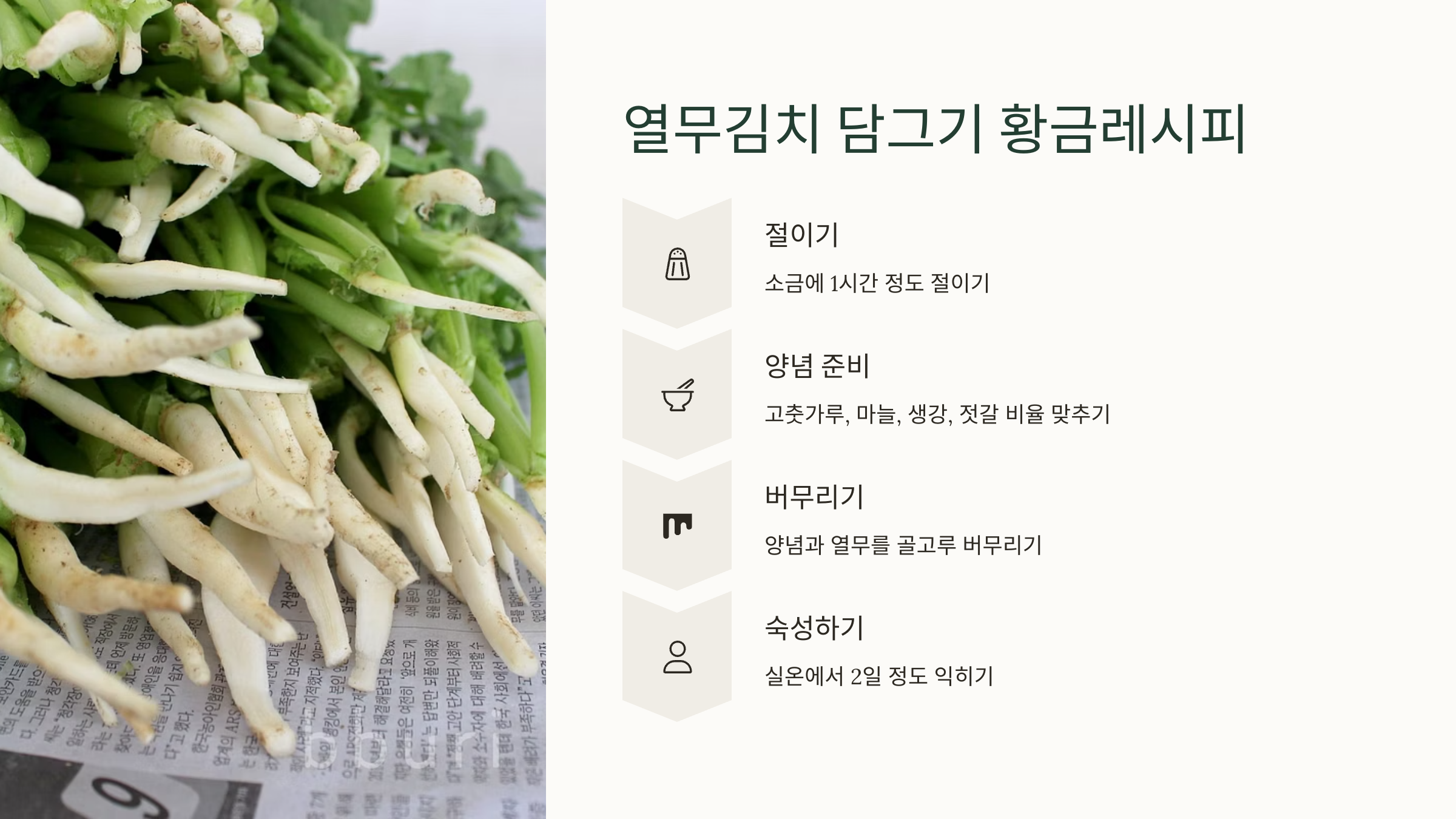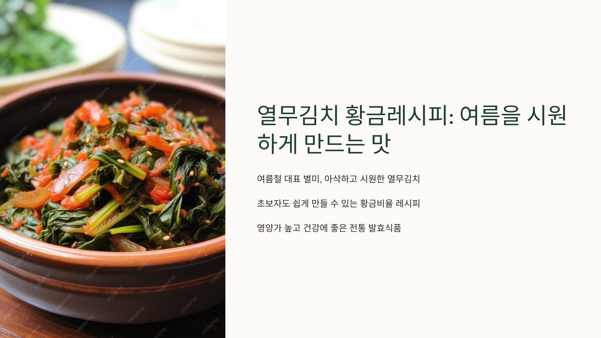 신선한 열무 선택부터 양념 비율, 숙성 비법까지 꼼꼼히 알려드릴 테니, 함께 맛있는 김치를 만들어보아요. 🥕
