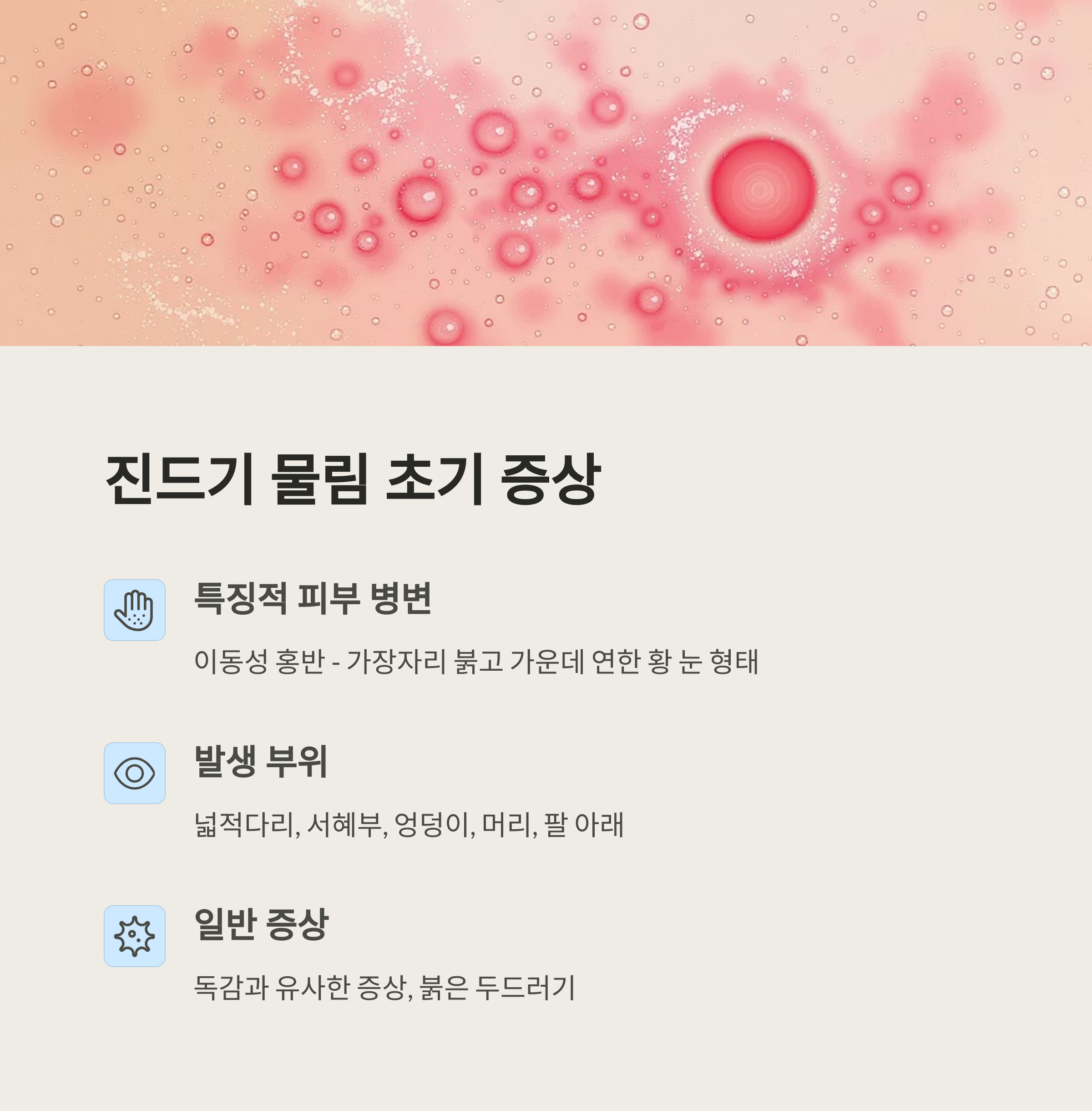 | 붉은 점 | 작고 붉은 반점, 가려움 동반 | 긁지 말고 소독하세요. |