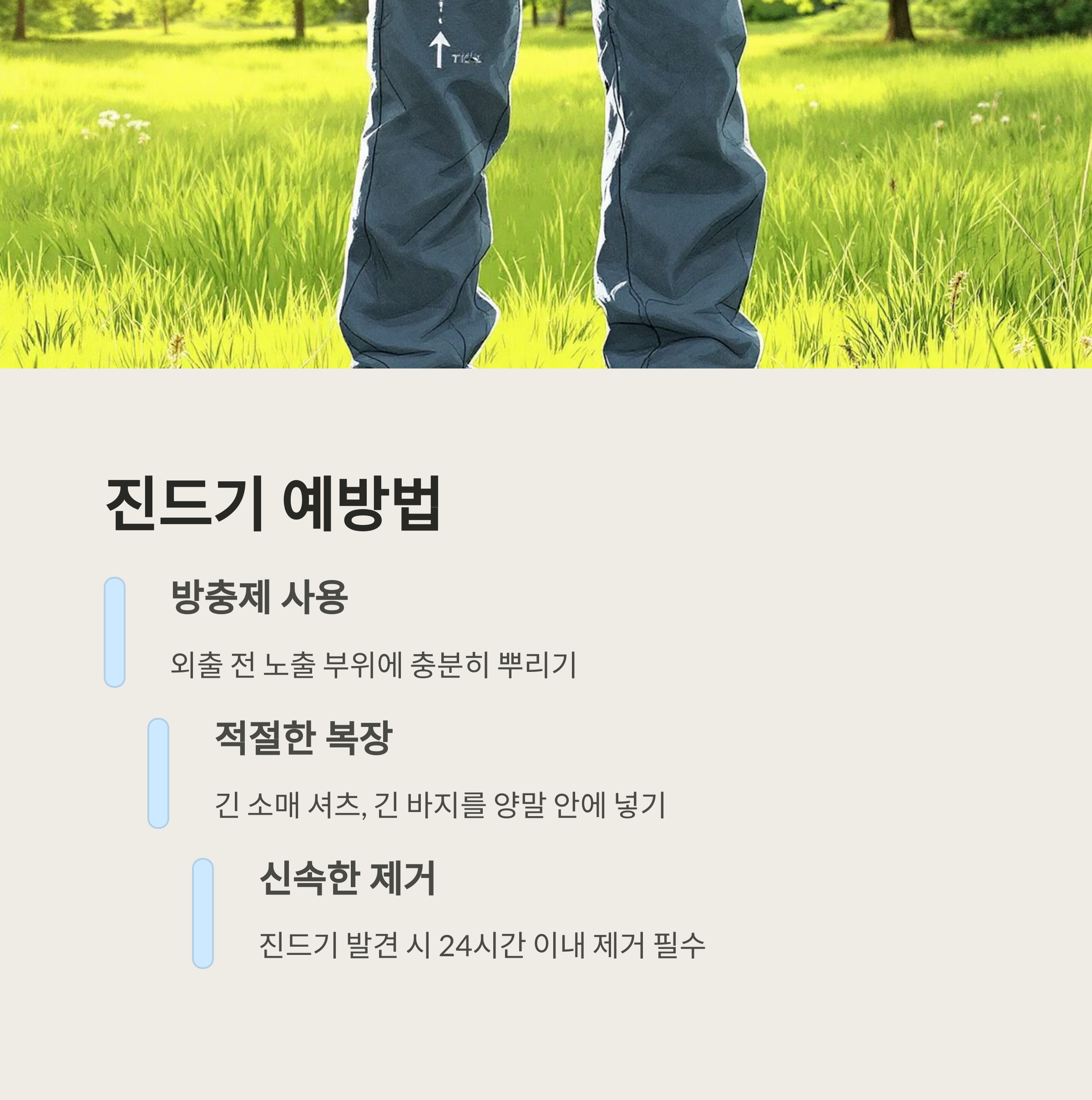 야외 활동 시 긴 옷을 입고, DEET 함유 기피제를 사용하세요. 활동 후에는 샤워하고 옷을 세탁하며, 몸 구석구석 진드기 유무를 확인해 보세요.