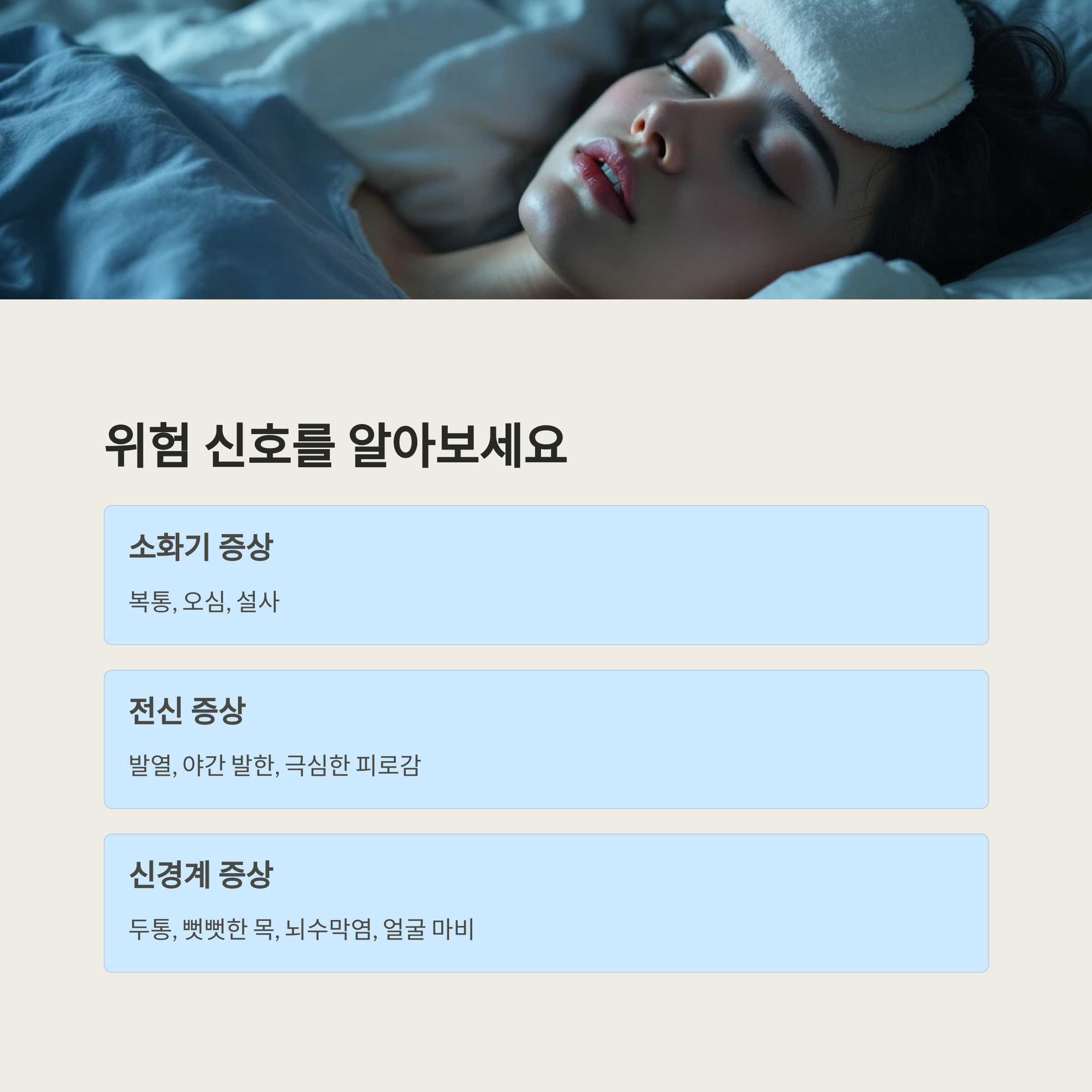 - 전신 증상: 4~15일 이내에 고열(38~40℃), 오한, 근육통, 구토, 설사 같은 증상이 나타난다면 즉시 병원을 방문해야 해요.