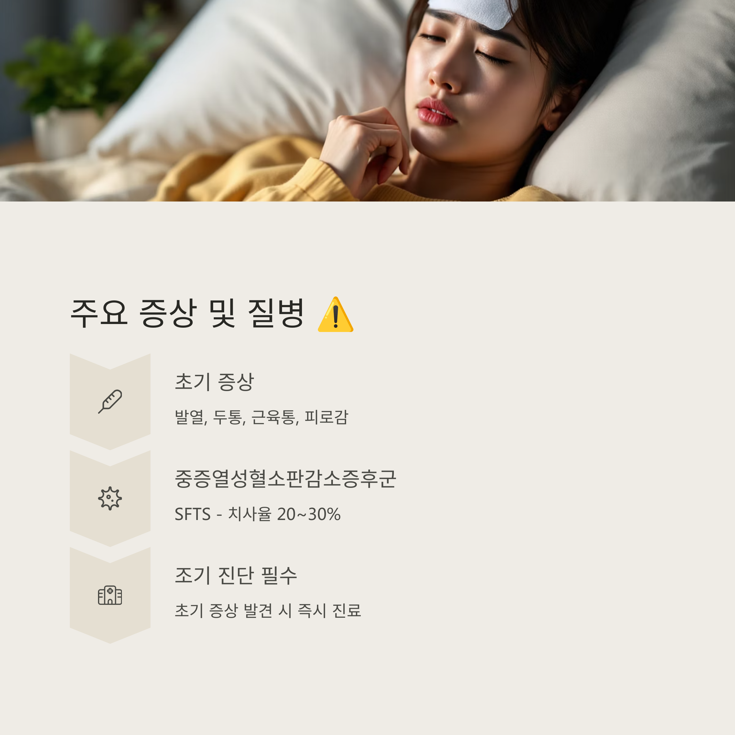 특히 중증열성혈소판감소증후군(SFTS)은 치사율이 20~30%에 달해 위험해요.