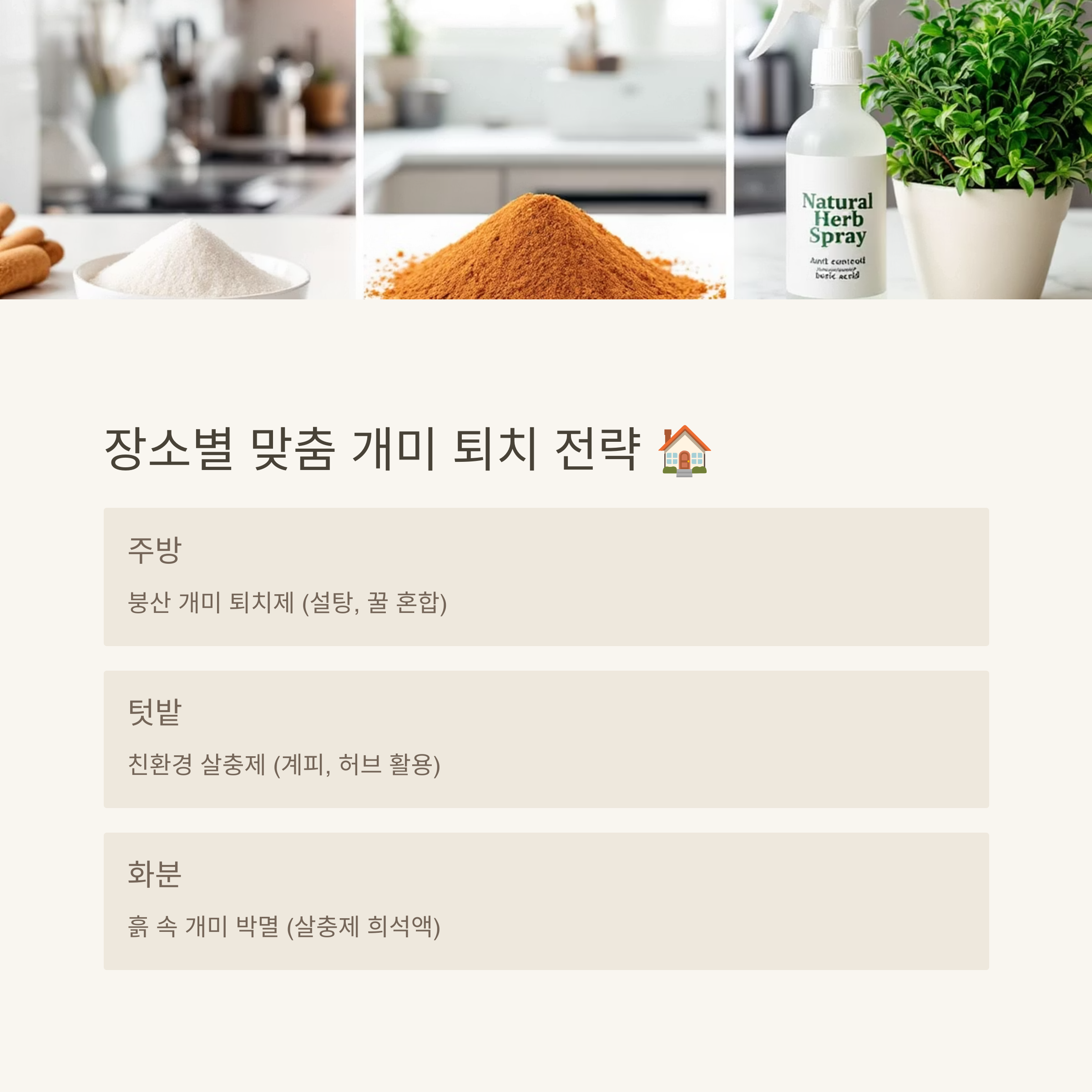 개미가 출몰하는 장소에 따라 효과적인 퇴치법이 다릅니다. 다음은 자주 개미가 나타나는 장소별 맞춤 퇴치법입니다.