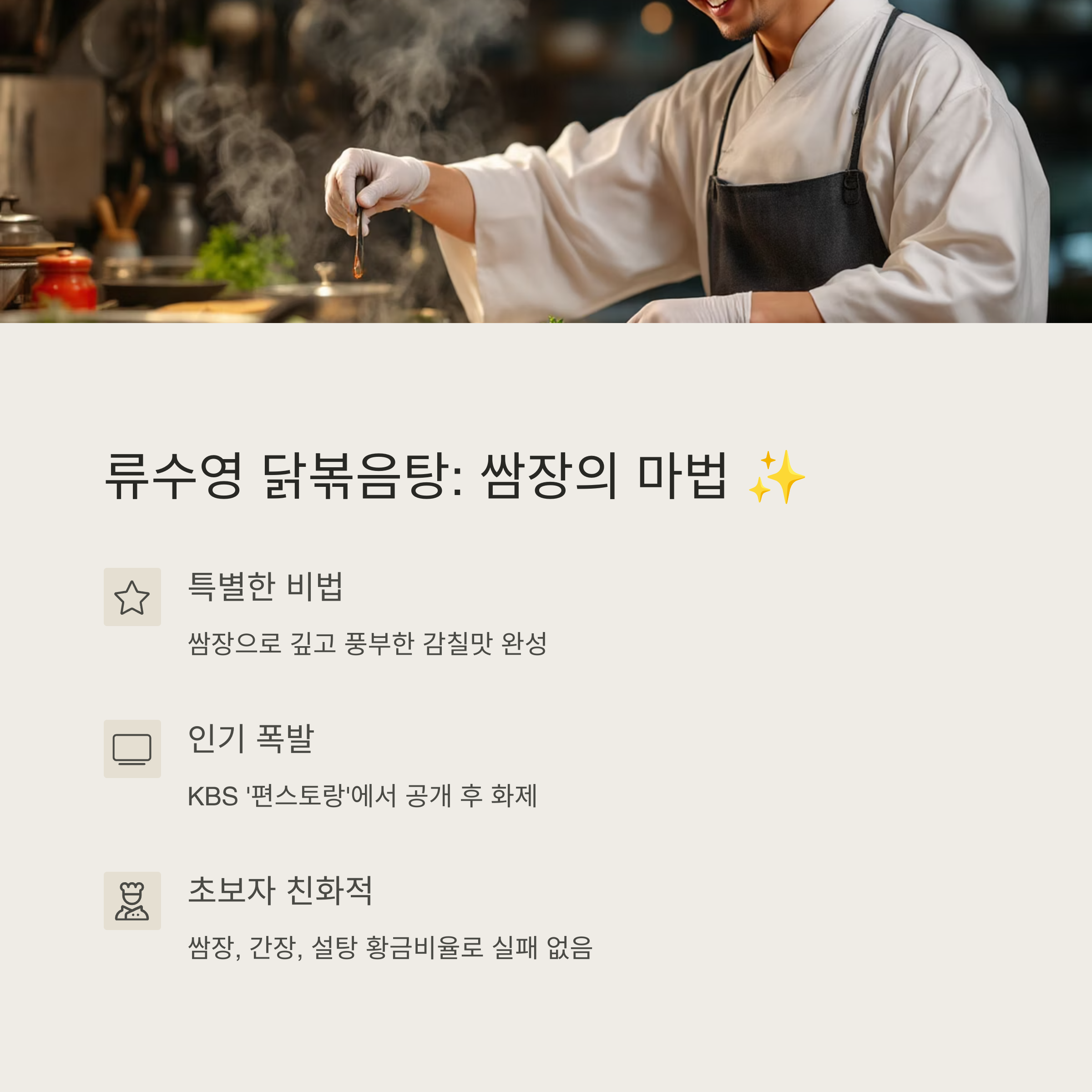 류수영의 닭볶음탕 황금레시피는 KBS ‘편스토랑’에서 공개된 이후 큰 화제를 모았어요. 쌈장을 활용해 깊은 감칠맛을 내고, 닭을 미리 구워 잡내를 없애는 과정이 핵심이에요.