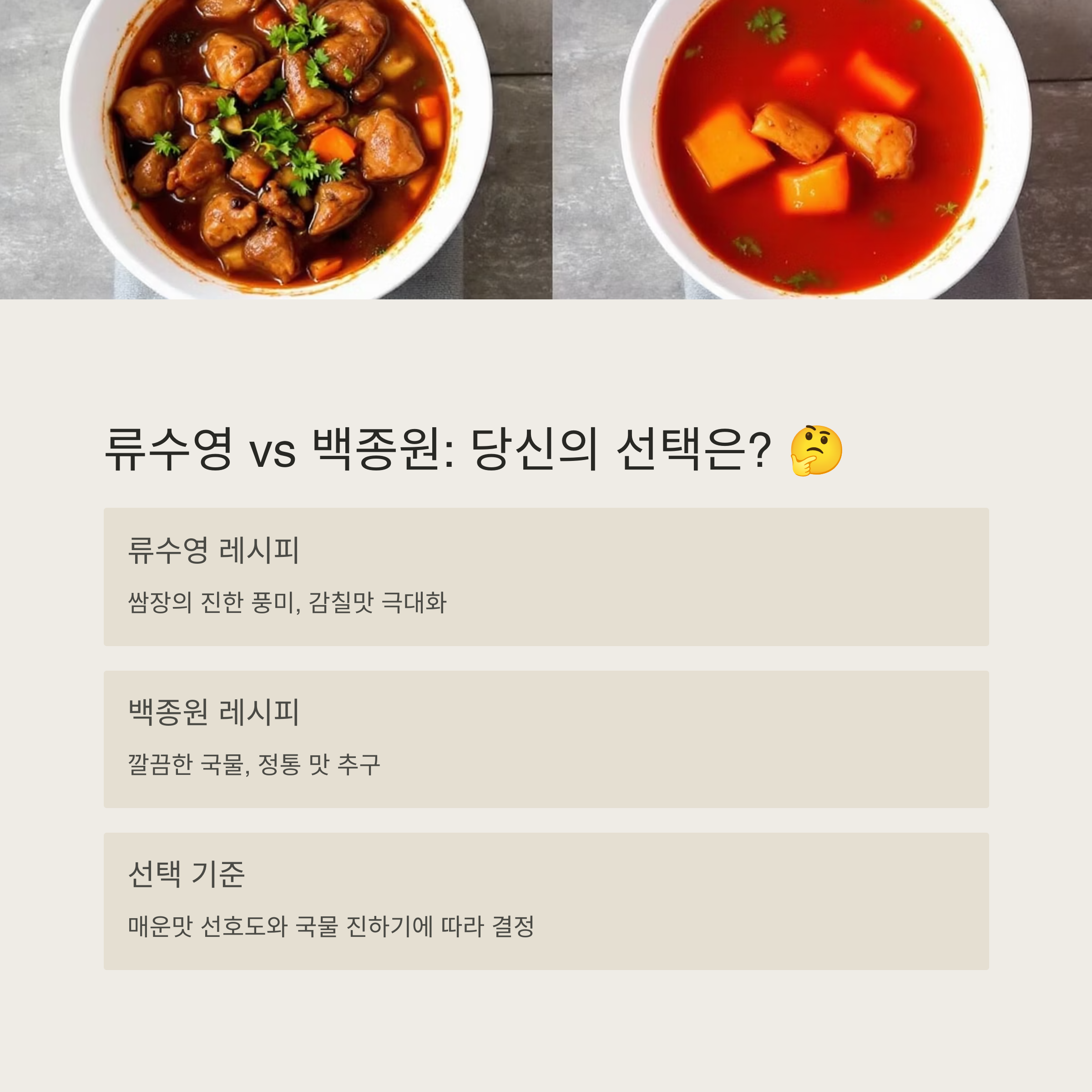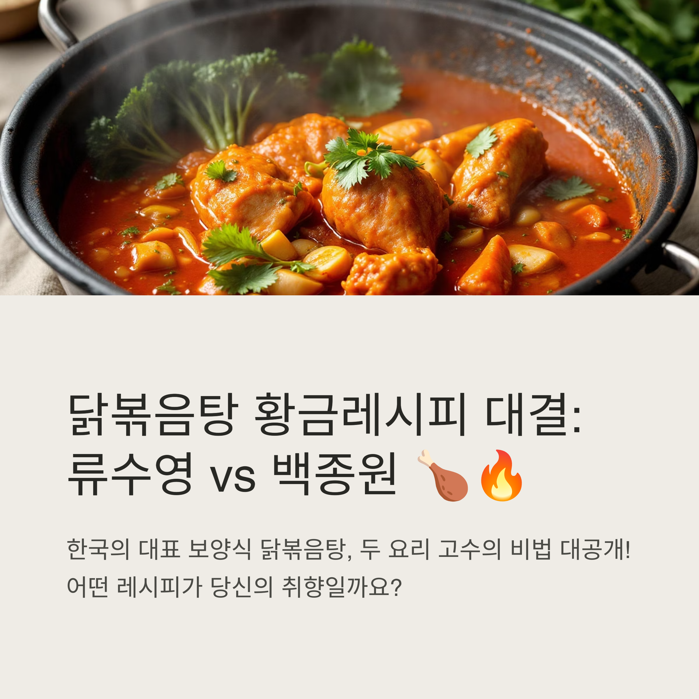 류수영의 감칠맛 넘치는 닭볶음탕 황금레시피와 백종원의 깔끔한 정석 레시피, 둘 다 집밥을 특별하게 만들어줘요. 😊
