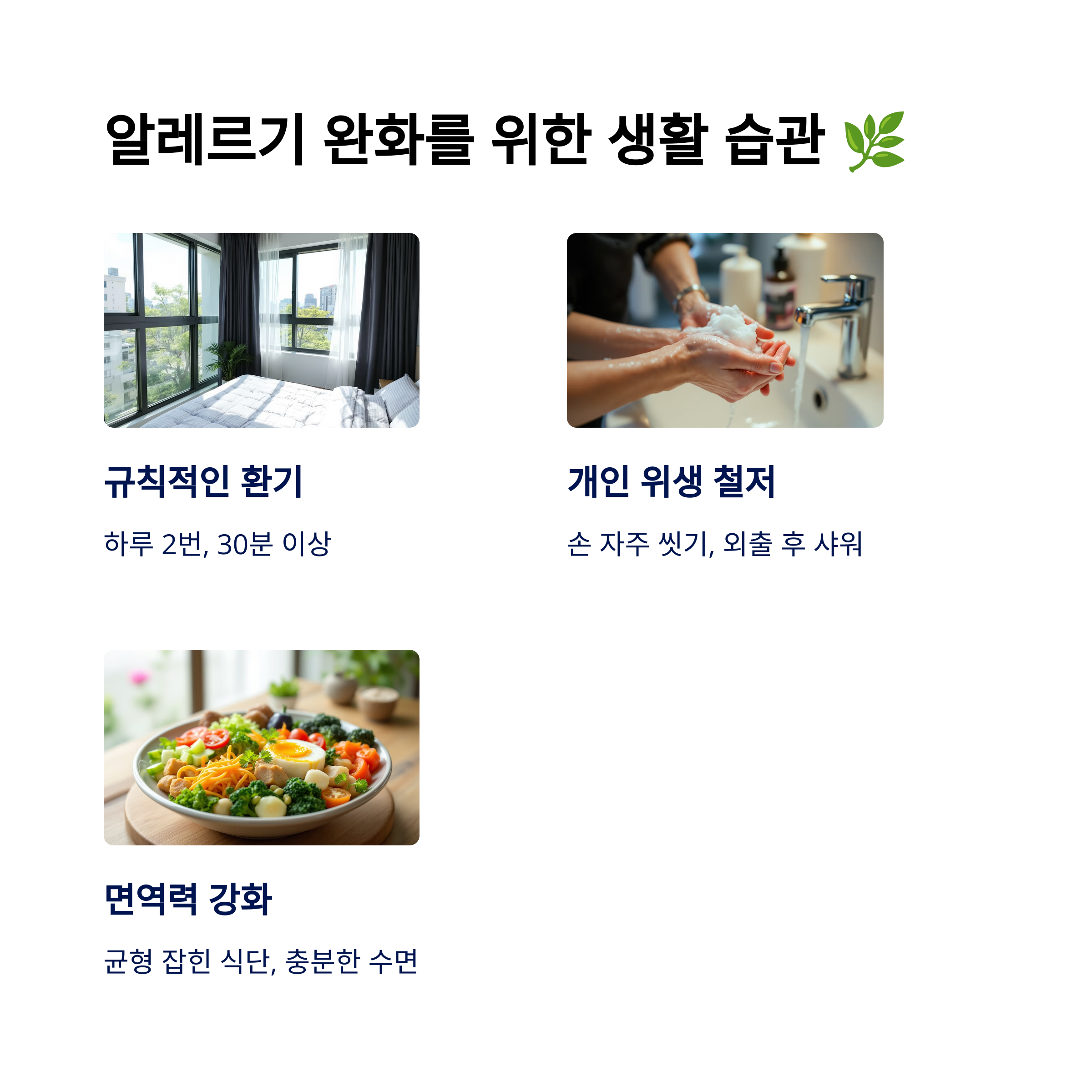 소아과 전문의와 상담해 알레르기 검사를 받고, 침구류를 자주 세탁하며 카펫을 제거하세요. 아이 방의 습도를 40% 이하로 유지하는 것도 중요합니다.