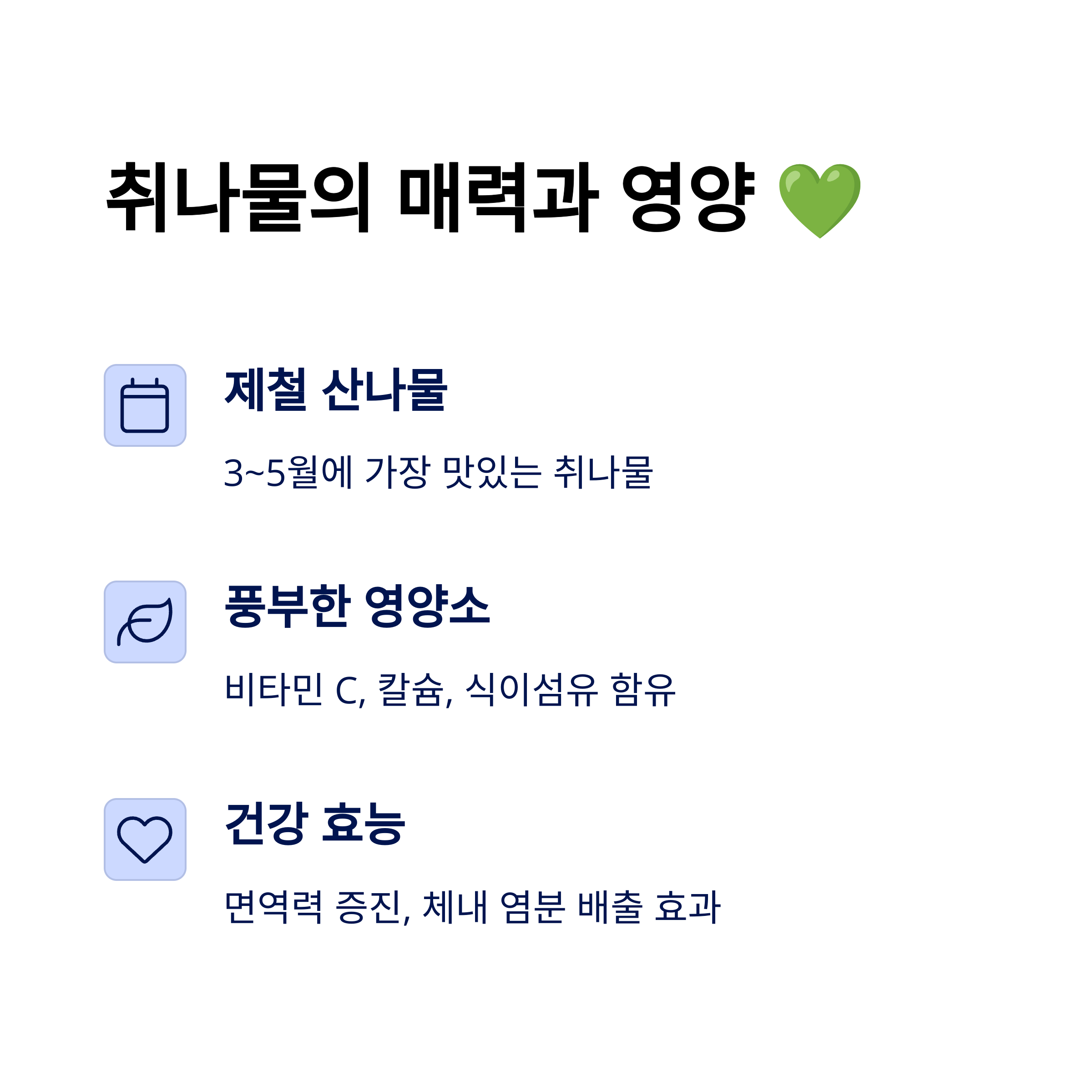 취나물은 한국의 대표적인 산나물로, 3~5월 제철에 가장 맛있습니다.