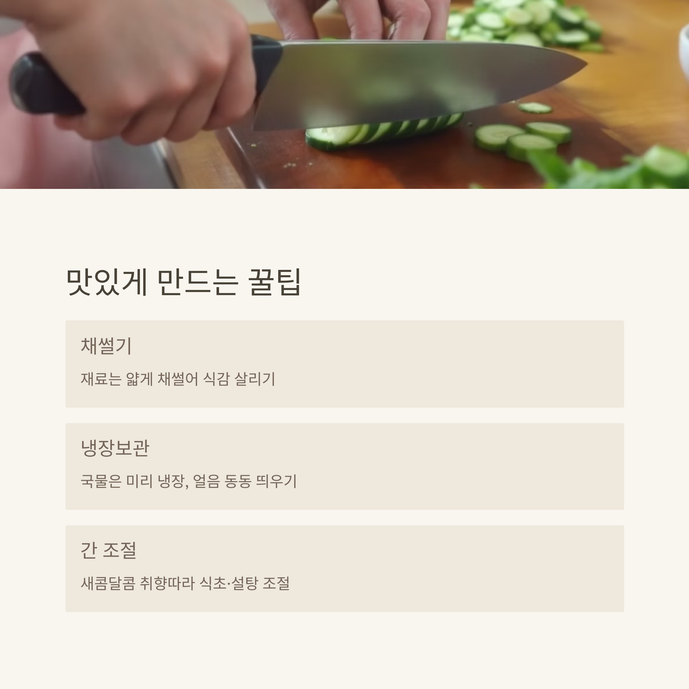 - 서빙 팁: 오이냉국은 차갑게 먹어야 제맛이에요. 서빙 전 냉장고에서 10분 정도 두거나, 얼음을 추가해 시원함을 극대화하세요.