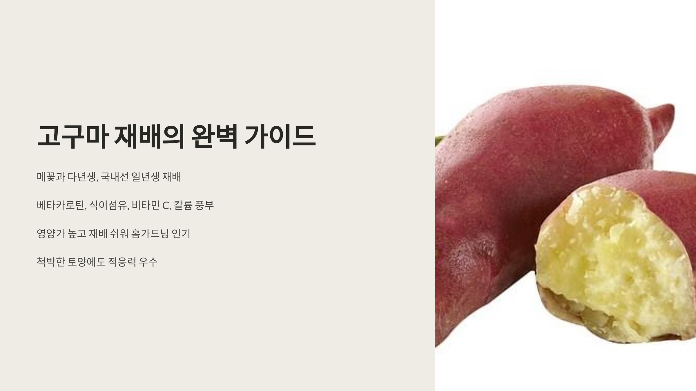 고구마는 따뜻한 기후를 좋아하는 작물로, 서리에 매우 약합니다. 우리나라에서는 봄에 심어 가을에 수확하는 패턴으로 재배됩니다. 특히 토양 적응성이 높아 척박한 환경에서도 비교적 잘 자란다는 장점이 있습니다.