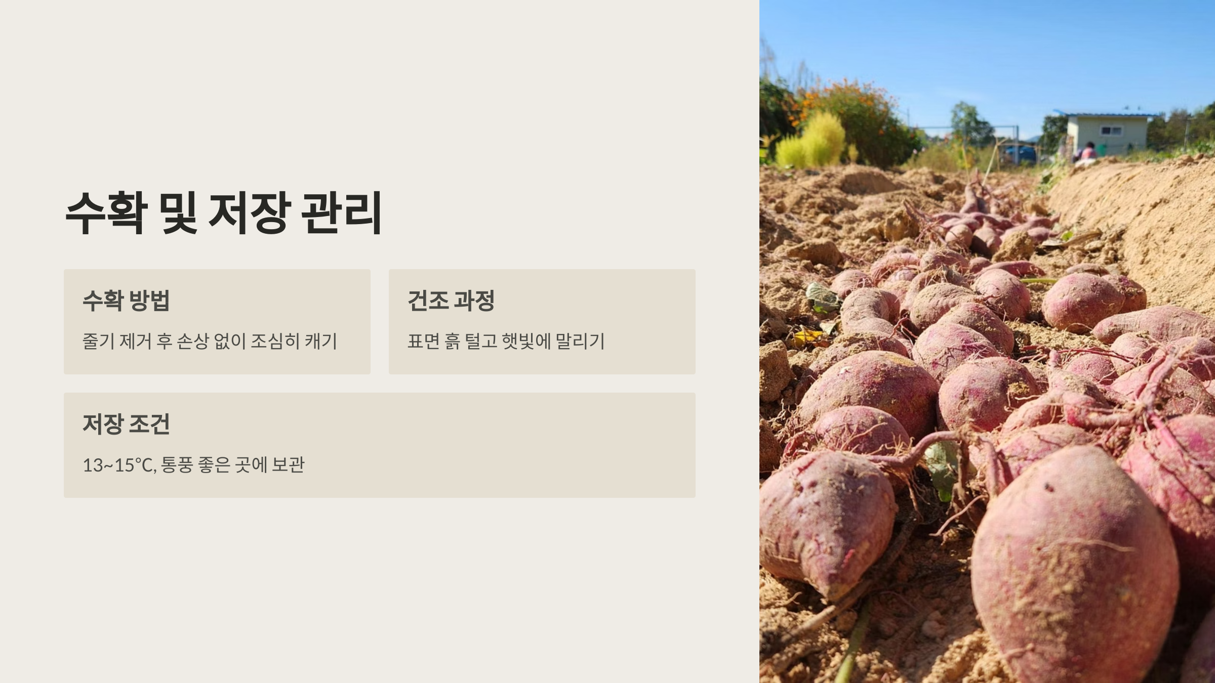 수확의 적기는 서리가 내리기 전입니다. 서리를 맞으면 고구마의 품질이 떨어지고 저장성도 나빠집니다. 수확한 고구마는 상처가 나지 않도록 조심스럽게 다루고, 건조하고 서늘한 곳에서 보관합니다.