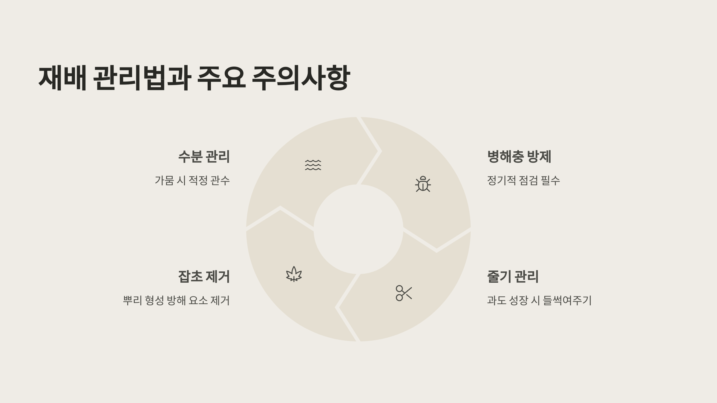 - 과습에 약하므로 배수 관리에 신경 쓰기