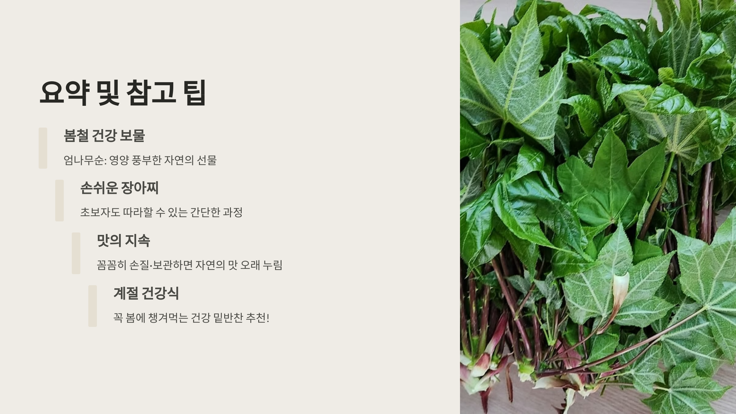 짧은 기간에만 만날 수 있는 엄나무순을 장아찌로 만들어 일년 내내 즐겨보세요. 이 글에서 소개한 엄나무순 장아찌 담그는법은 초보자도 쉽게 따라할 수 있으면서 엄나무순의 영양과 맛을 최대한 살릴 수 있는 방법입니다.