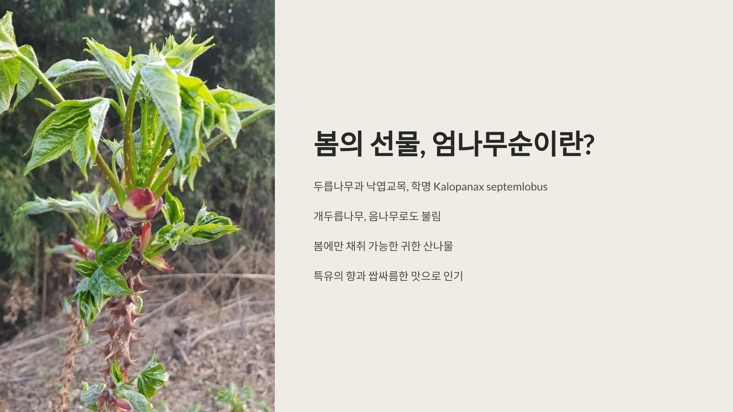 봄이 깊어갈수록 산과 들에선 새로운 생명력이 피어납니다. 그중에서도 특별한 향과 맛을 자랑하는 엄나무순은 봄철 한정으로 만날 수 있는 귀한 산나물입니다.