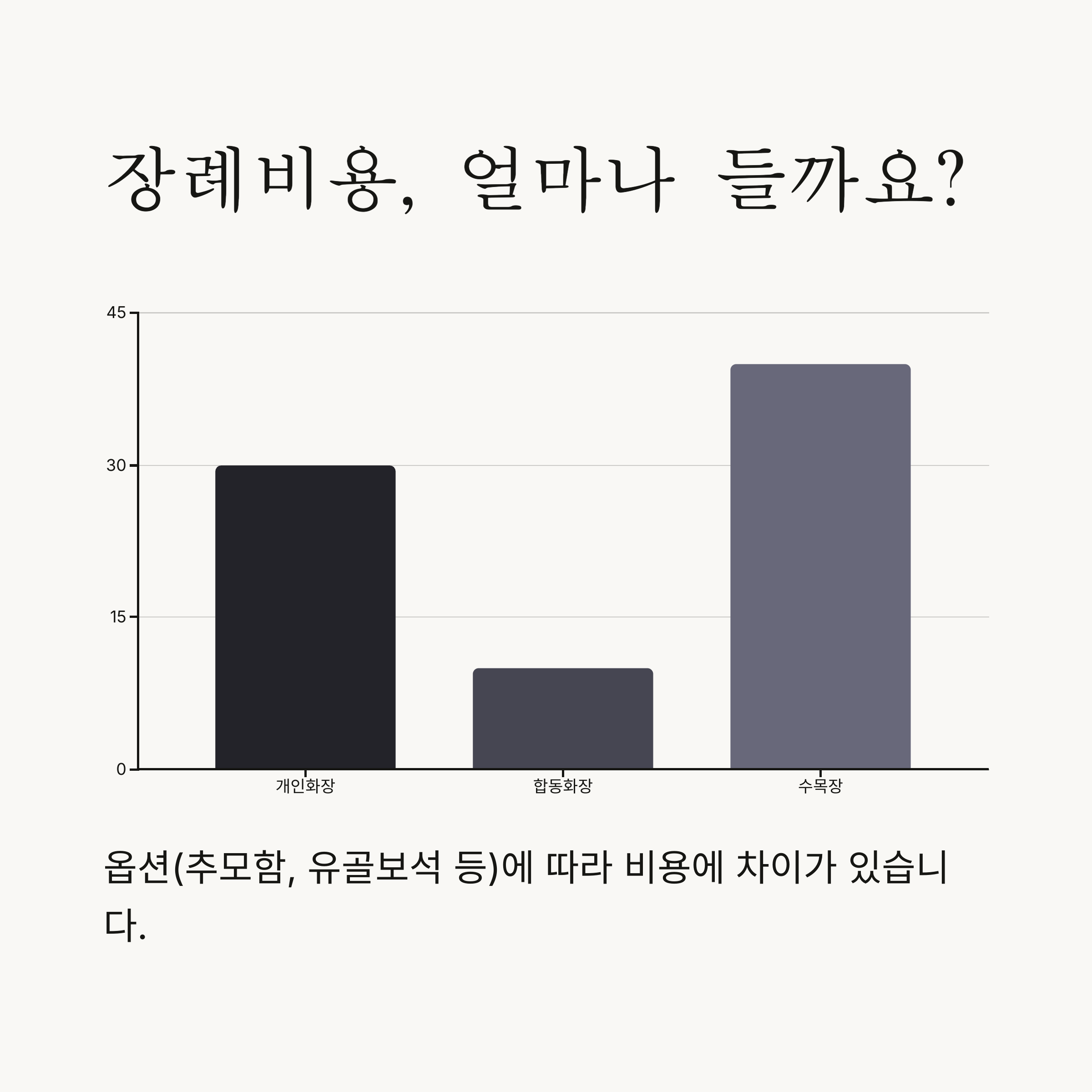 | 수목장/자연장 | 화장 후 유골을 자연에 뿌리거나 나무 밑에 묻는 방식 | 20만원~50만원 |