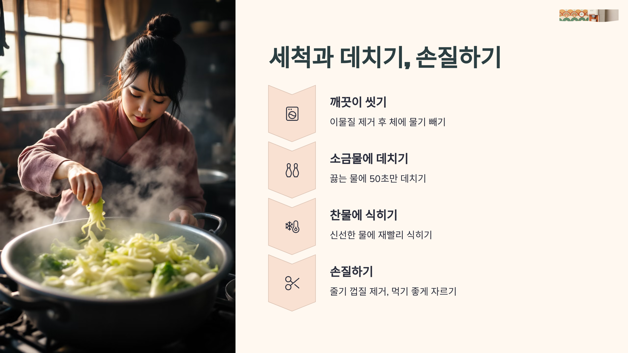 머위의 쓴맛을 줄이기 위해 소금물에 살짝 데쳐주는 과정이 필요합니다. 끓는 물에 소금 1큰술을 넣고 머위를 약 1분간 데친 후 찬물에 바로 담가 식혀주세요. 이때 머위가 너무 물러지지 않도록 데치는 시간에 주의해야 합니다.