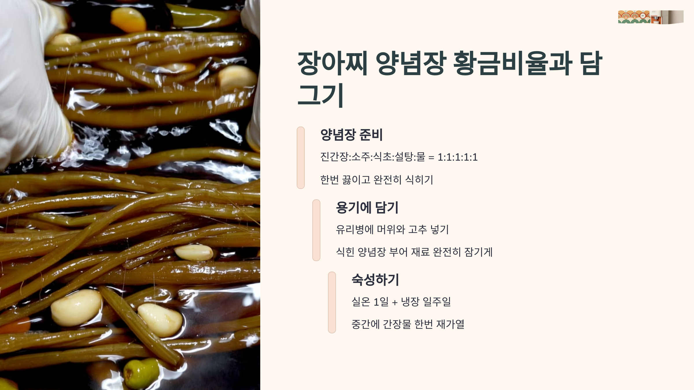 머위장아찌는 최소 3일에서 일주일 정도 상온에서 숙성시켜야 제대로 된 맛이 납니다. 이후에는 냉장 보관하면서 드시면 됩니다. 머위장아찌 담는법에서 가장 중요한 것은 바로 이 숙성 과정입니다.