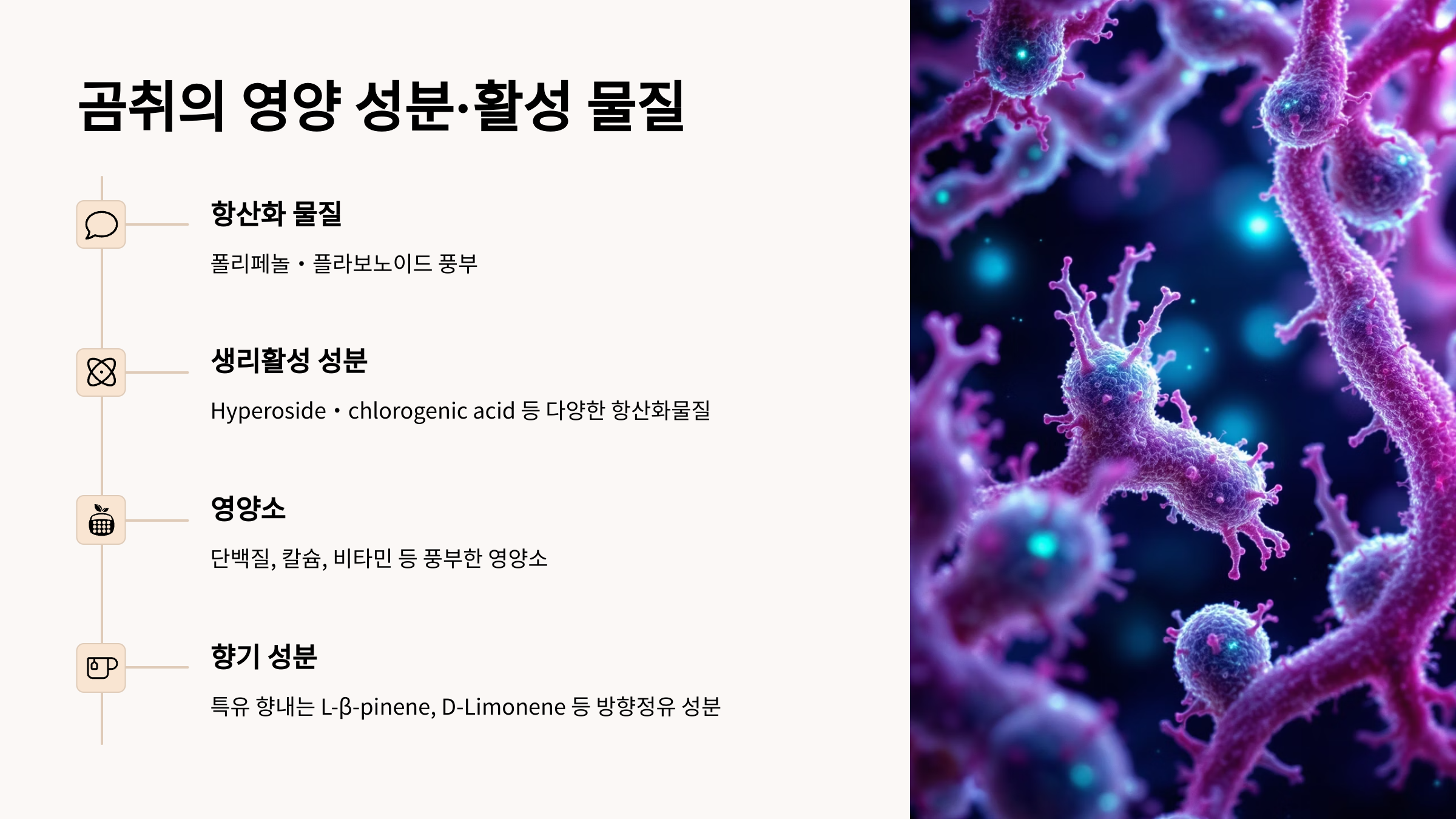 곰취에는 폴리페놀, 플라보노이드, 비타민 C 등 항산화 물질이 풍부합니다. 이러한 곰취 효능은 체내 활성산소를 제거하고 세포 손상을 방지하는 데 도움을 줍니다.